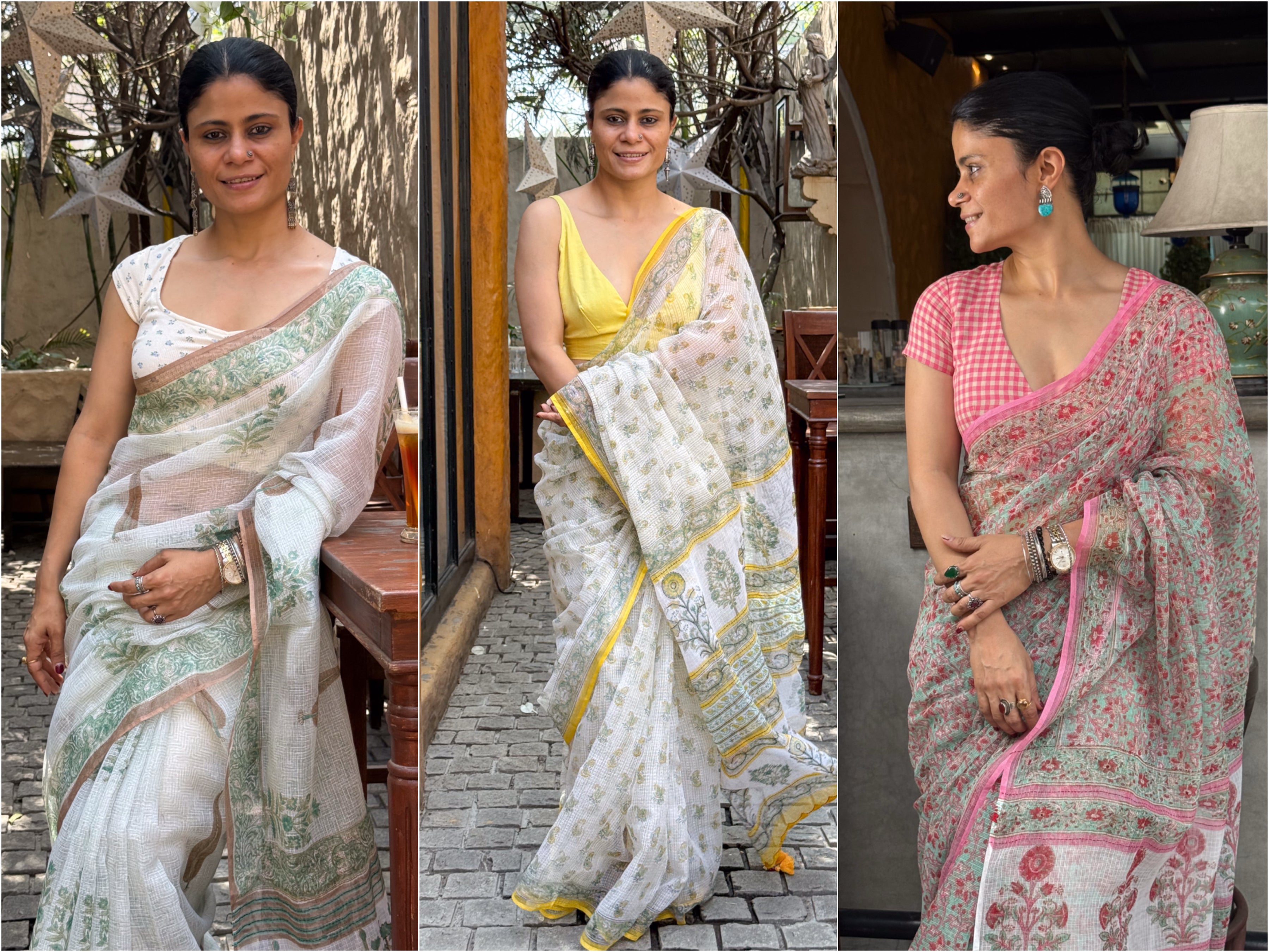 Handblock Printed Kota Dorai Saree With Hand Embroidered Running Stitch.