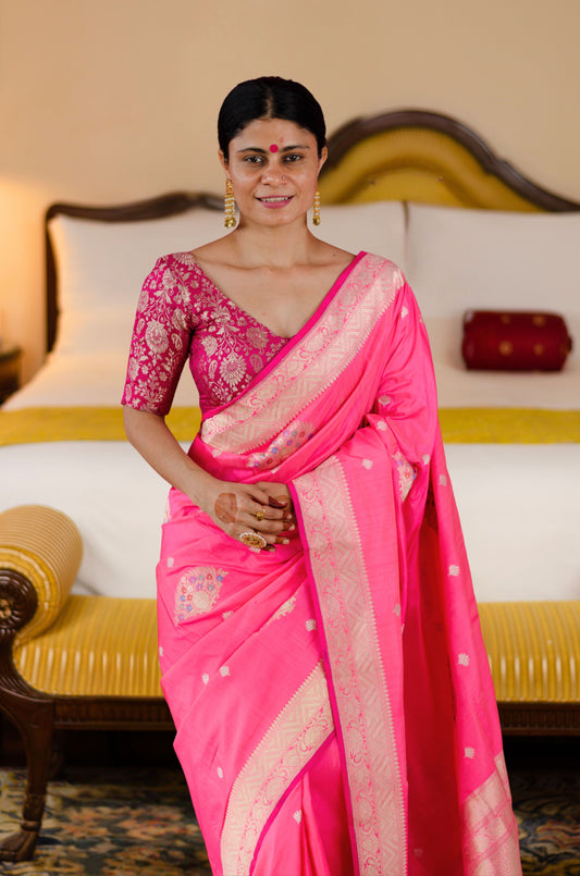 Baby Pink with silver Texture Colour Handwoven Kadwa Katan Silk Banarasi Saree