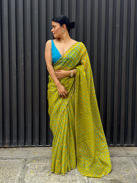 Handloom Hand Block Printed & Hand Embroidered Kota Silk Saree