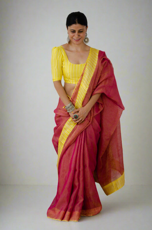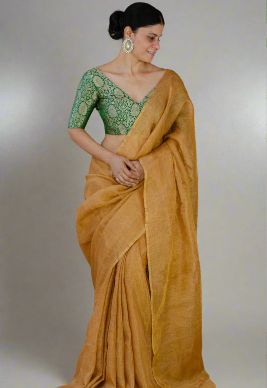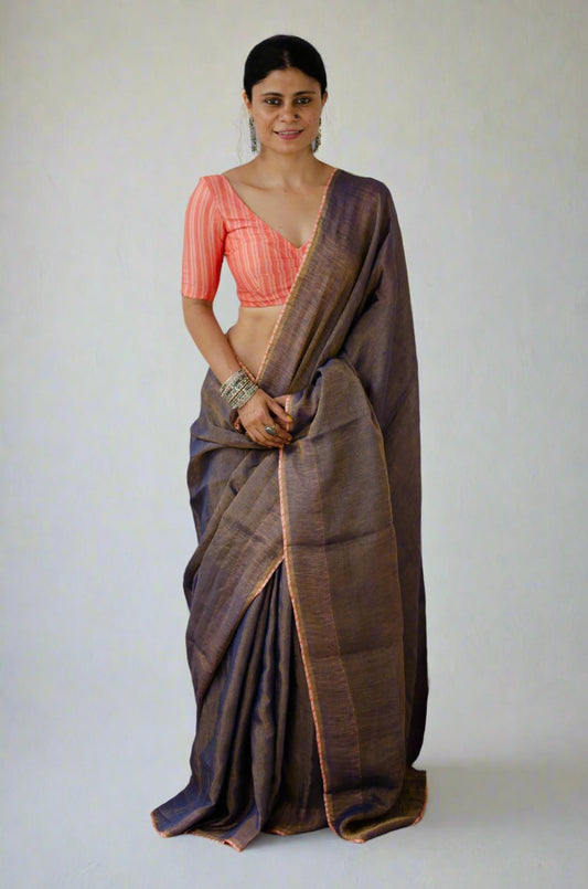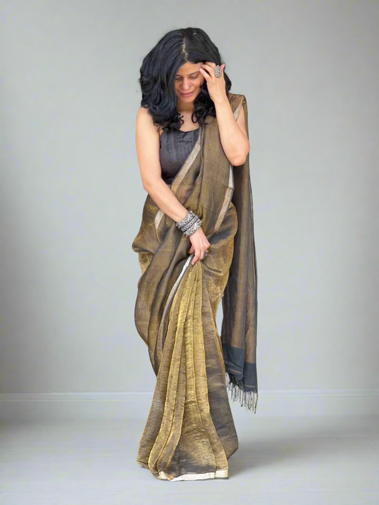 Handloom Linen Silk Metallic Saree With Woven Motifs In Tissue Silk Pallu.