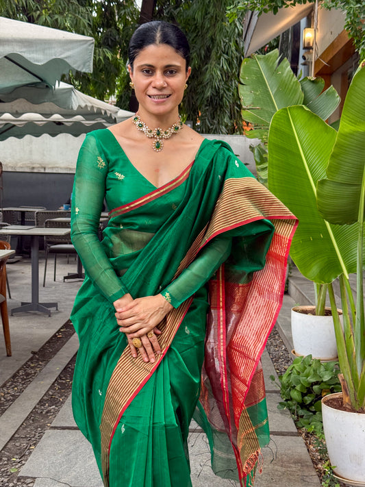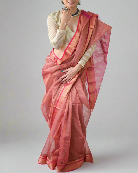 Handloom Metallic Linen Saree With Handblock Printed Organza Silk Fabric Patch Work