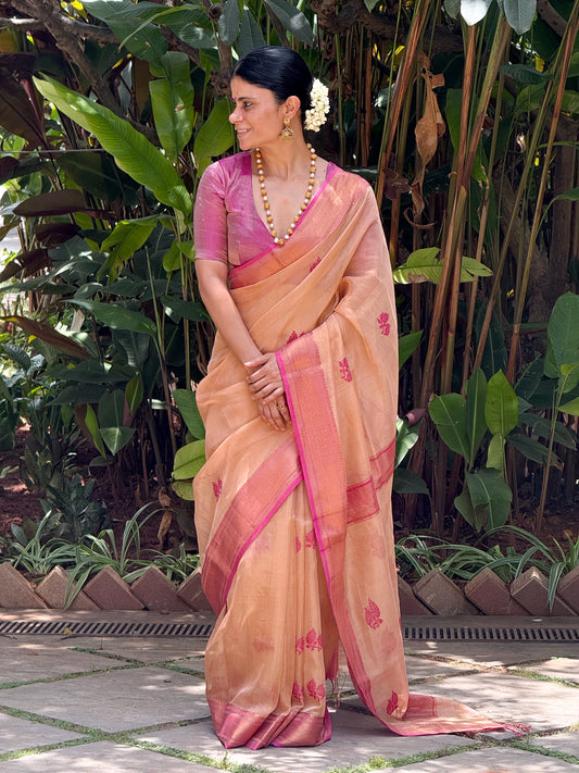 Handloom Tissue Silk Saree Adorned With Handmade Motifs
