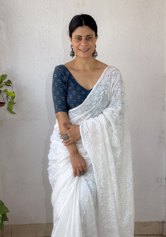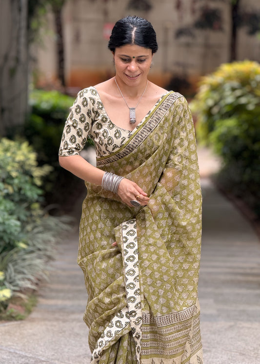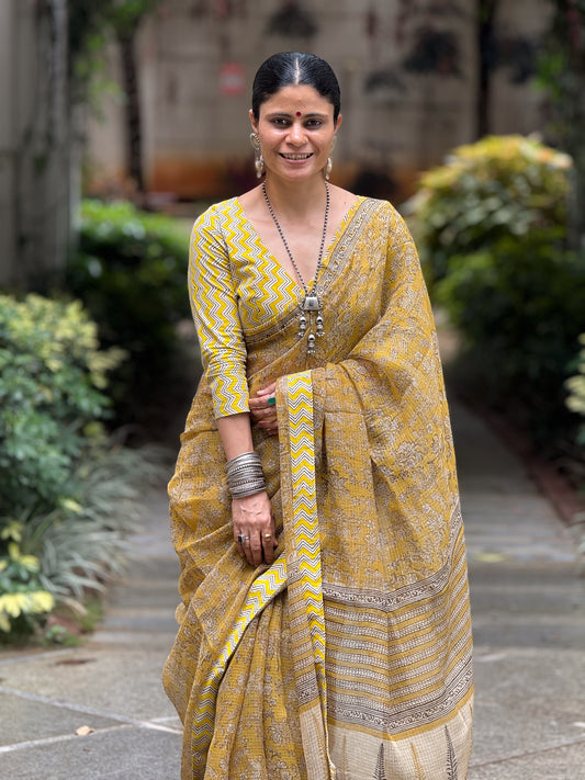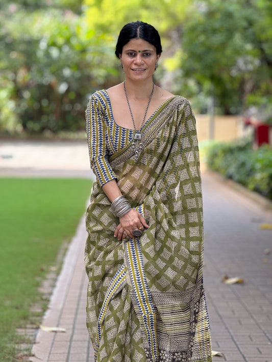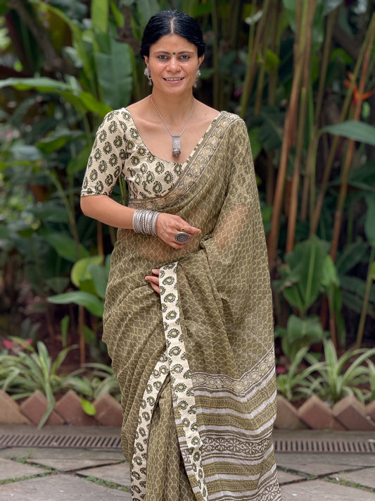 Handmade Natural Dyed Handblock Bagru / Dabu Printed Kota Doria Saree With Dabu Patch Border.