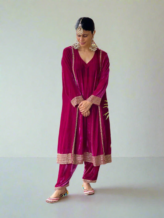 Hand embroidered Pure Silk Velevet kalidar Kurta with Pant