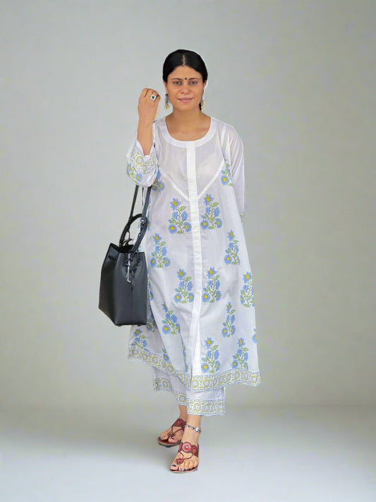 Handloom & handblock printed Kalidar kurta with yoke designs with pant.