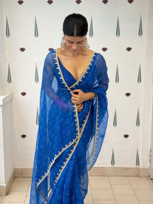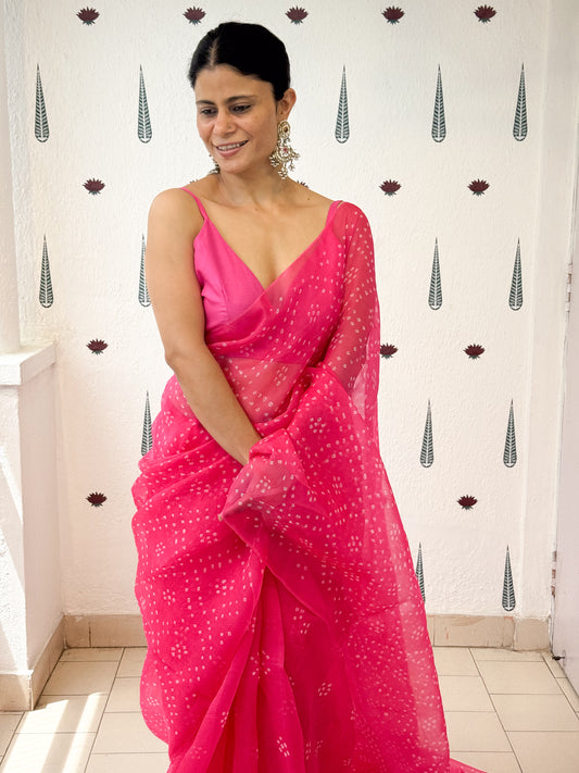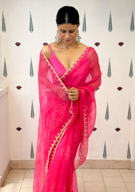 Handloom & Hand Embroidered Bandhini Organza Silk Saree .