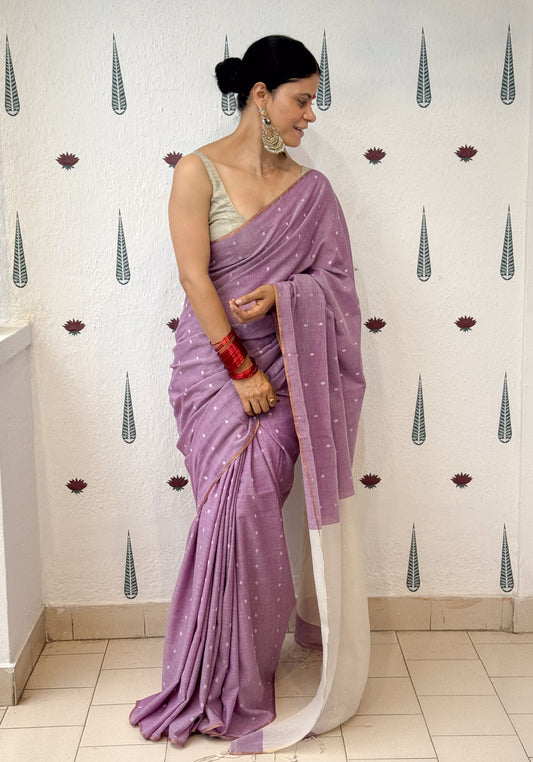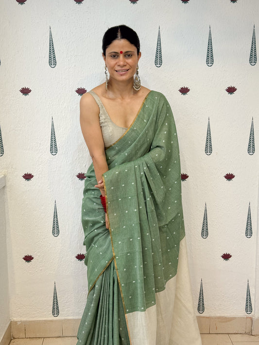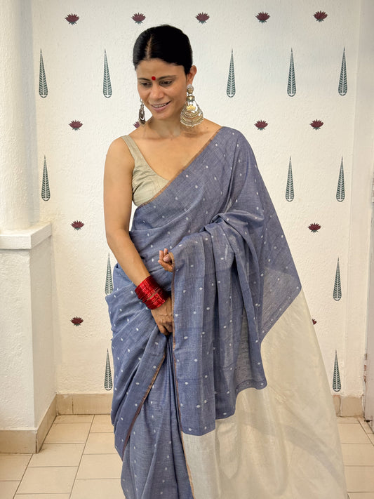 Handloom Linen Silk Metallic Saree With Woven Motifs In Tissue Silk Pallu.