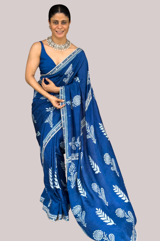 Handloom Hand Block Printed & Hand Embroidered Mulberry Silk Saree