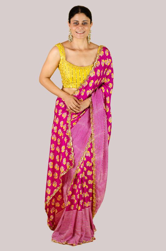 Handloom Hand Block Printed & Hand Embroidered Georgette Silk Saree