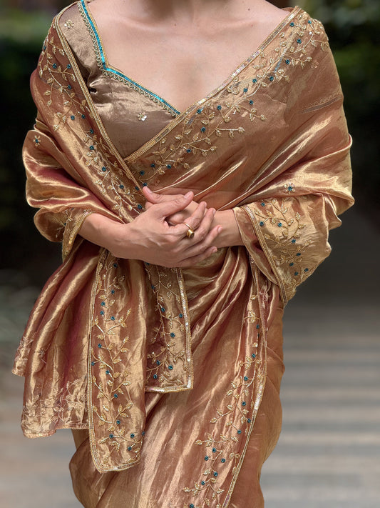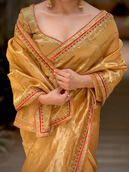 Zardozi & Beads Hand Embroidered Handloom Tissue Silk Saree.