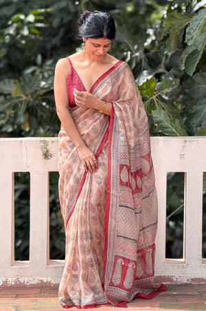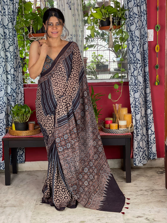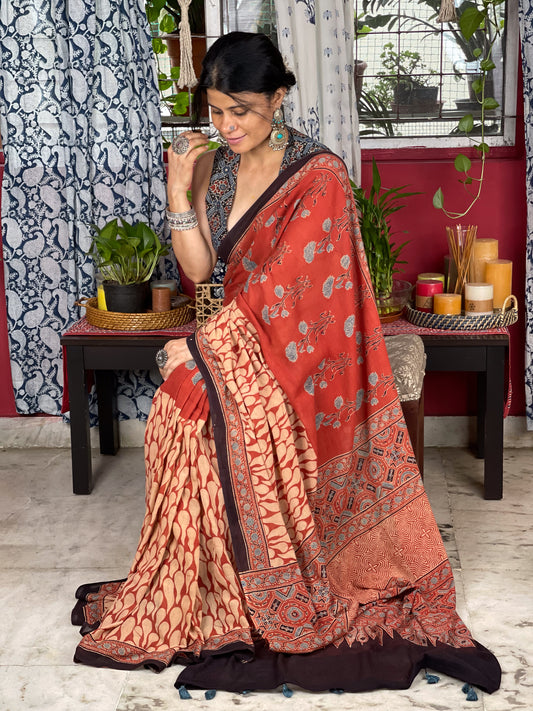 Handblock Printed Natural Dyed Ajrakh Mull Cotton Saree
