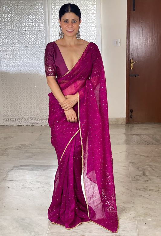 Hand Embroidered Mukaish Work Organza Silk Saree