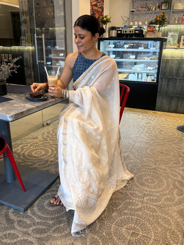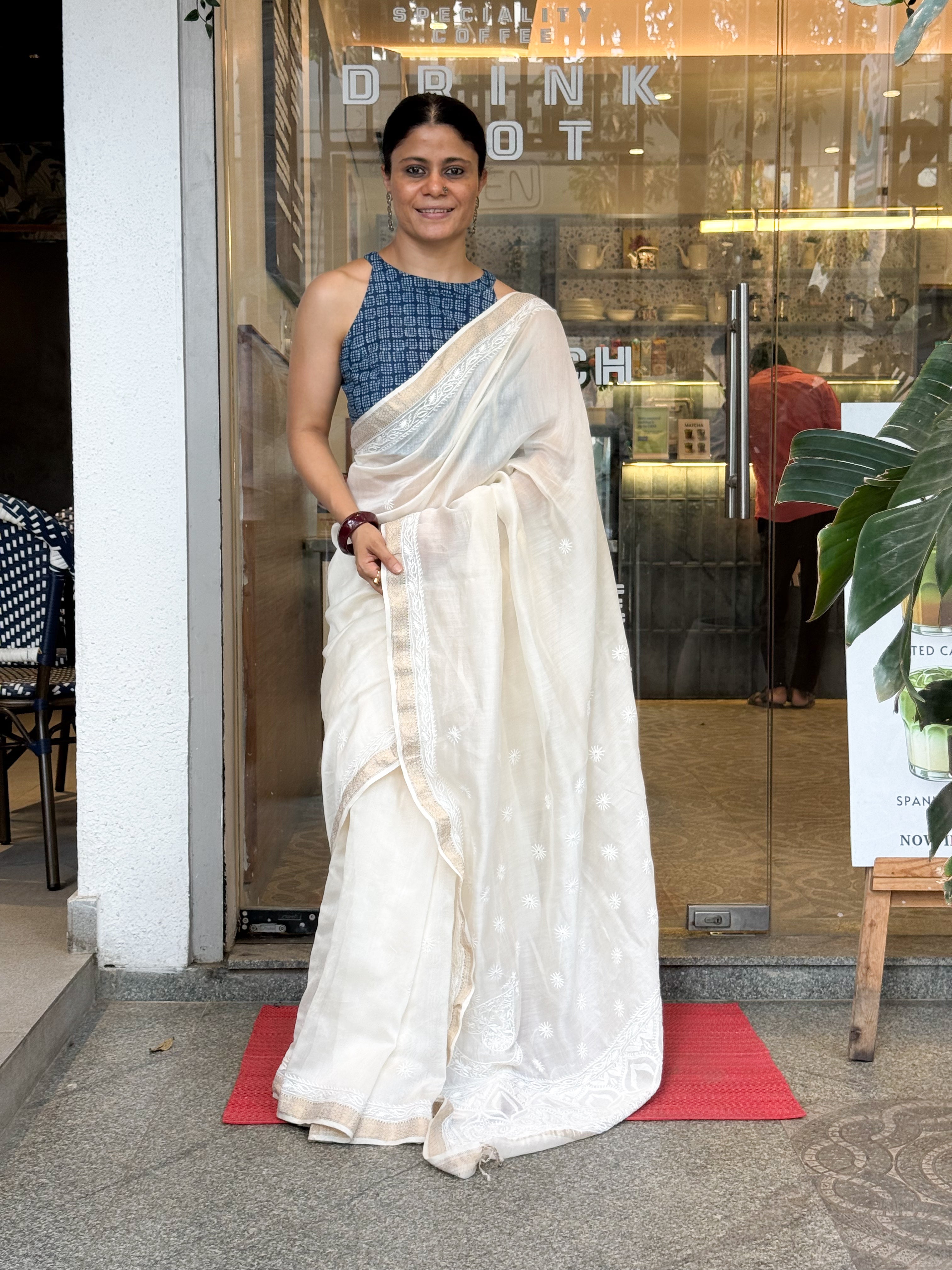 : Chanderi MuslinA heavy hand-embroidered Chikankari saree crafted on delicate chanderi silk fabric