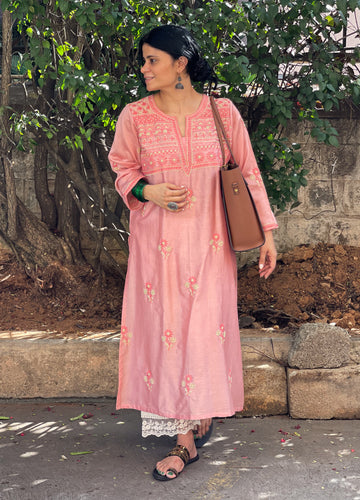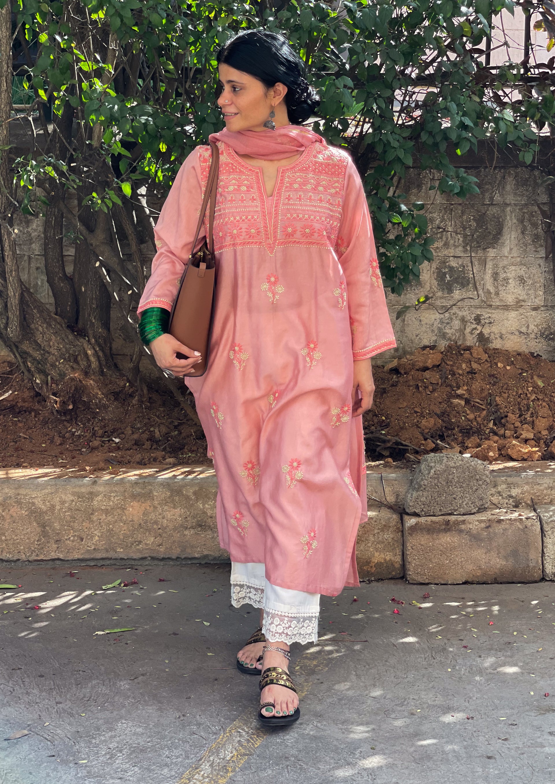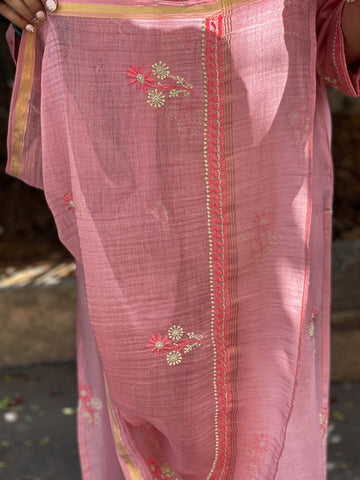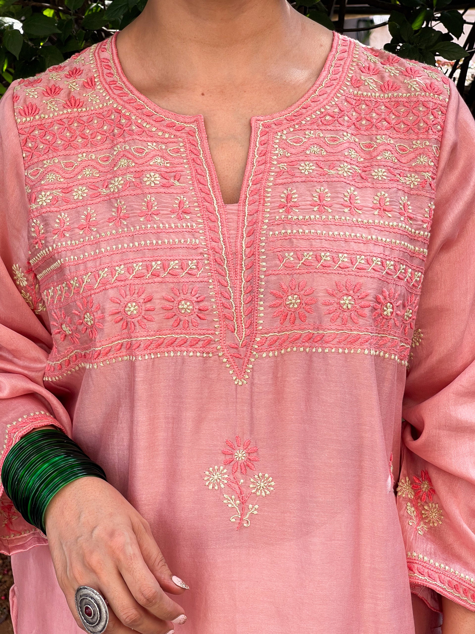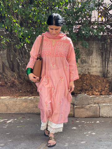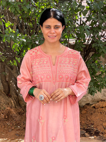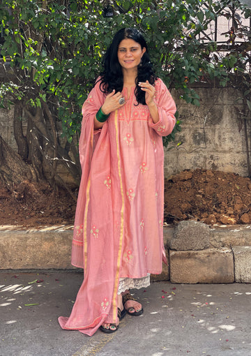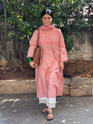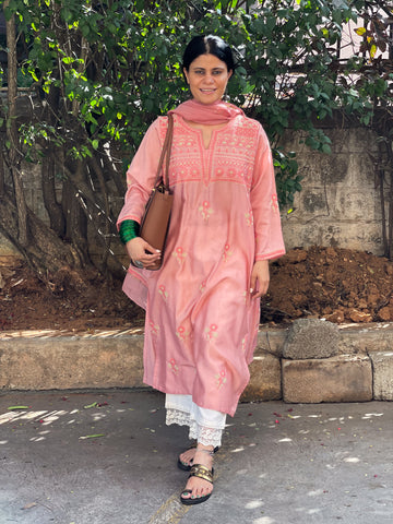 Handembroidered chikankari Silk Chanderi Kurta with Dupatta