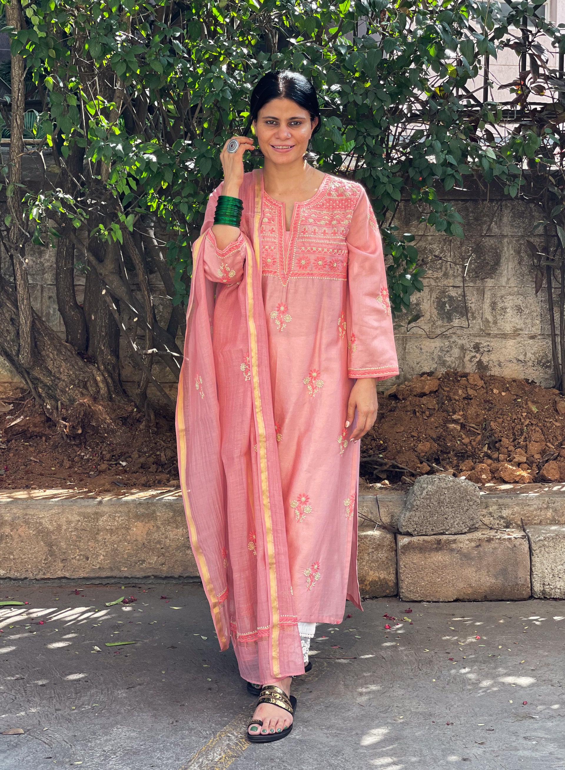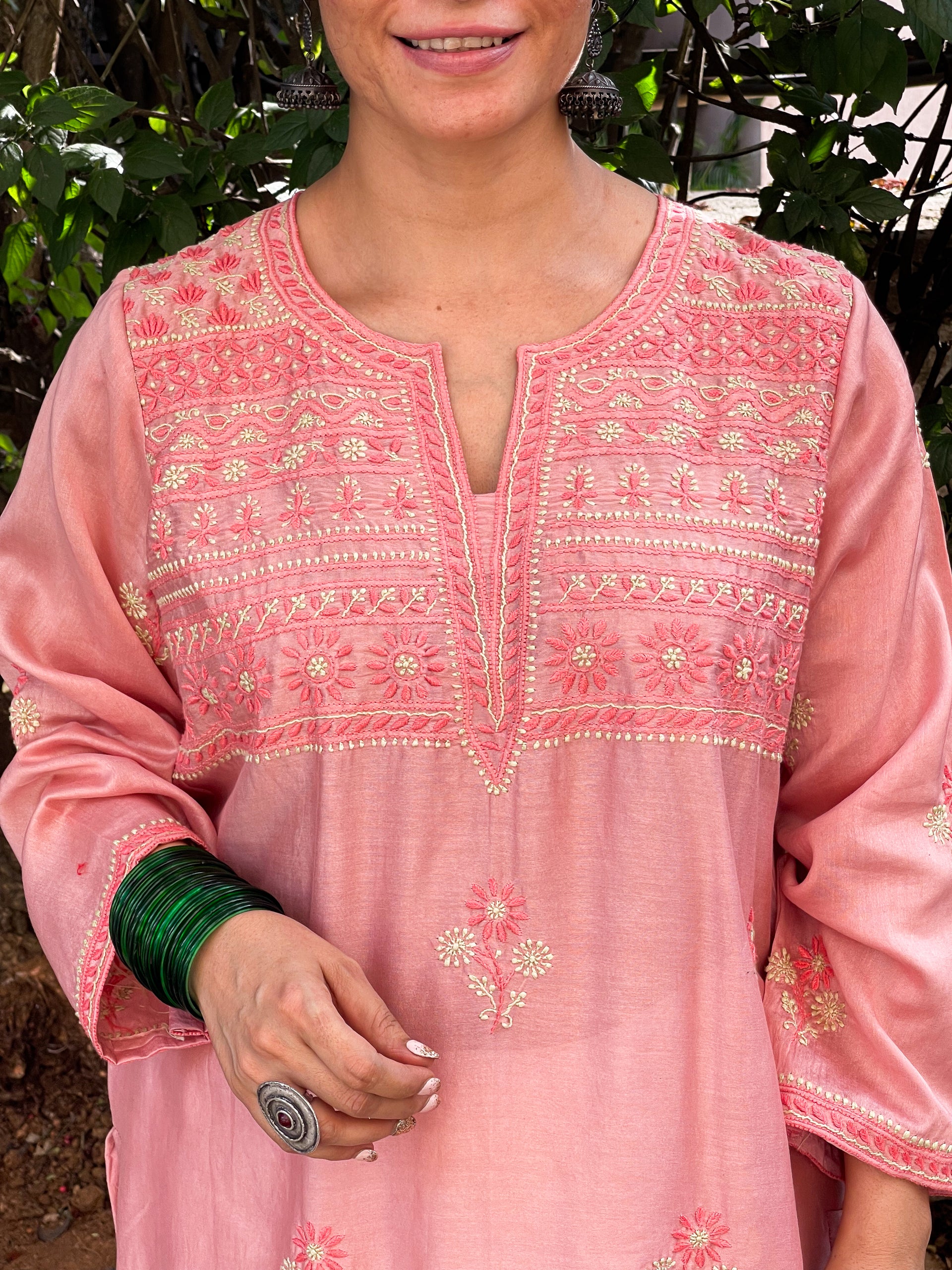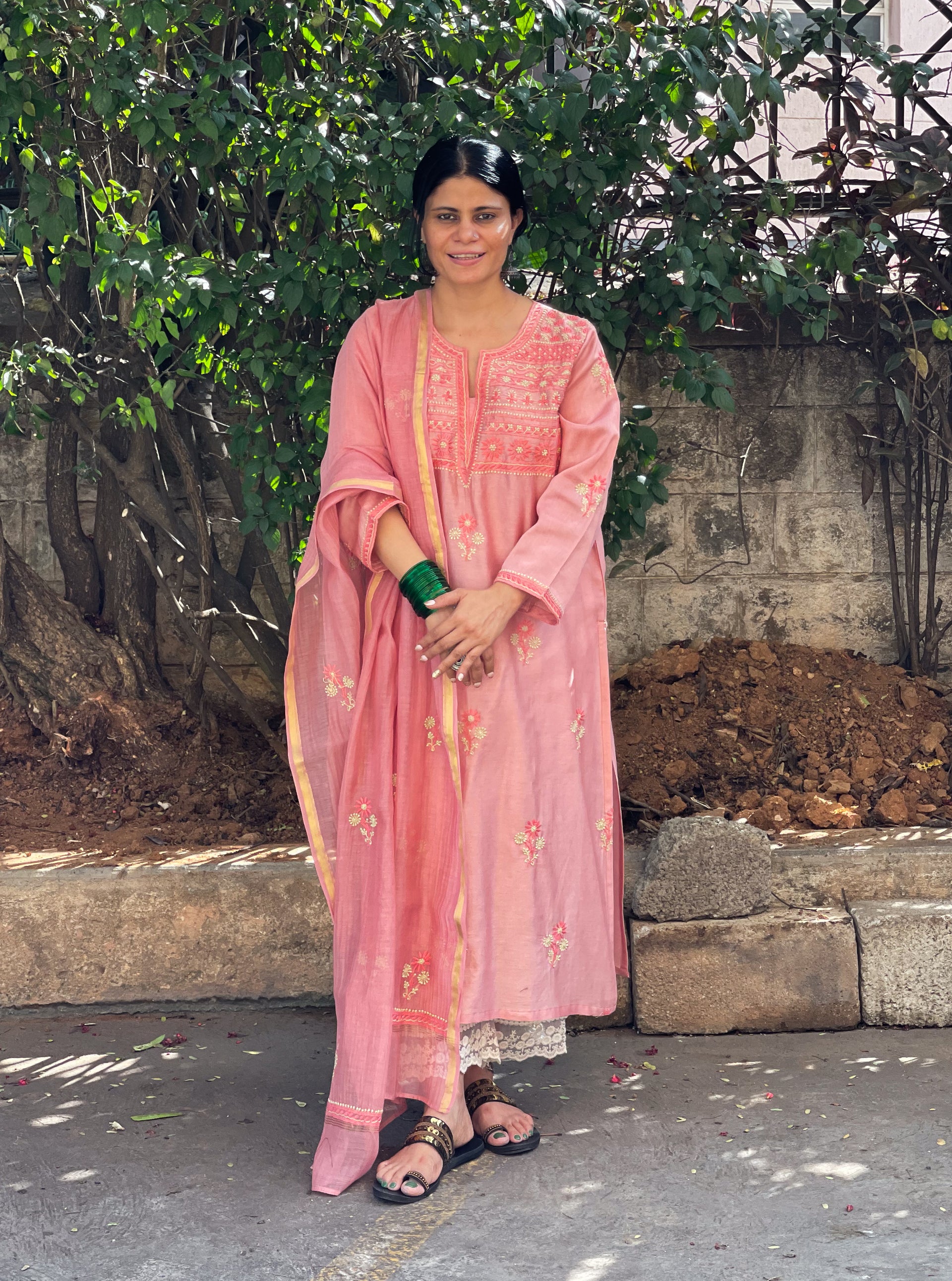 Handembroidered chikankari Silk Chanderi Kurta with Dupatta