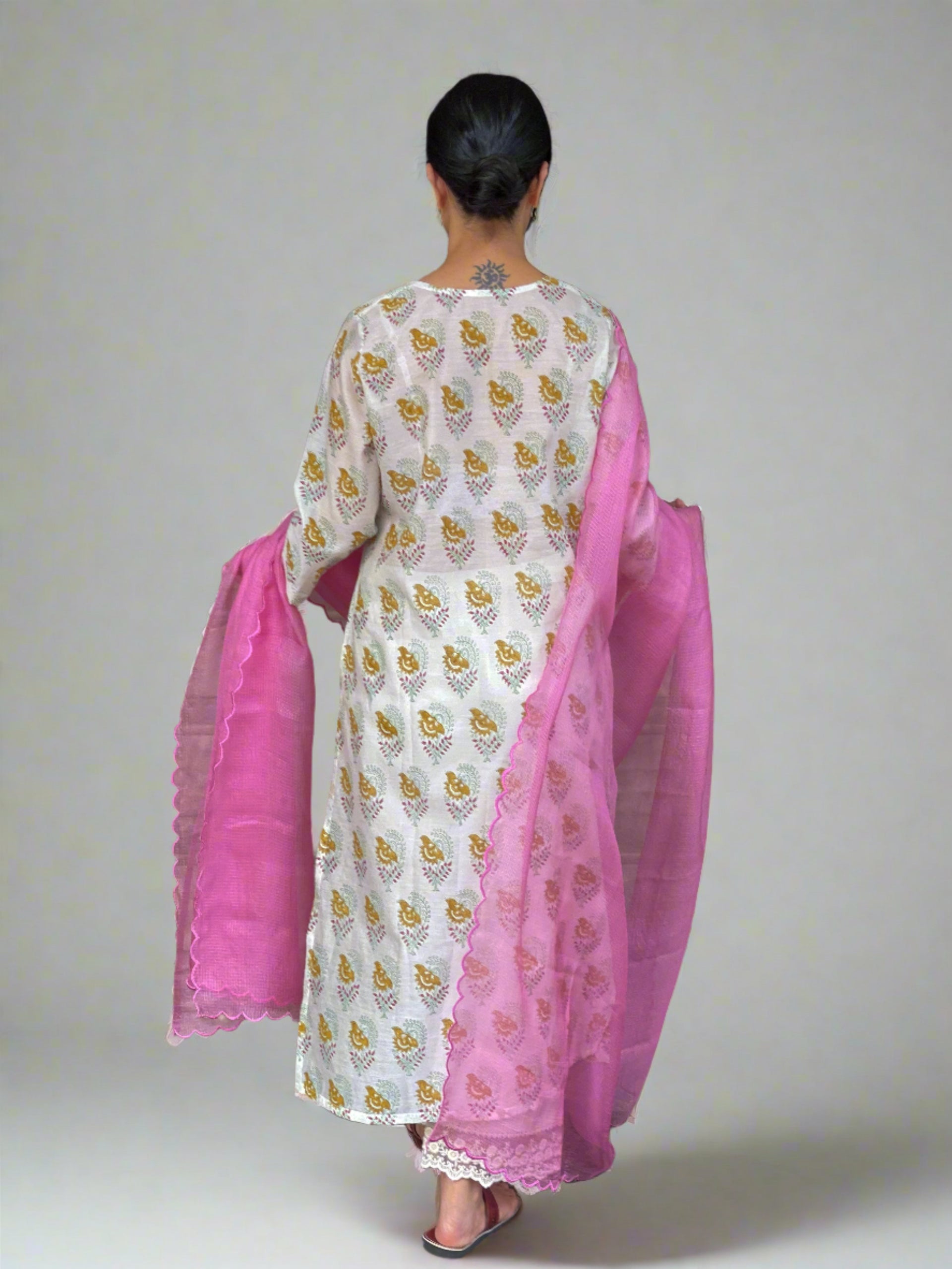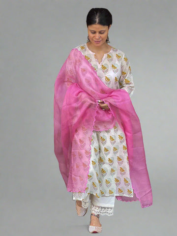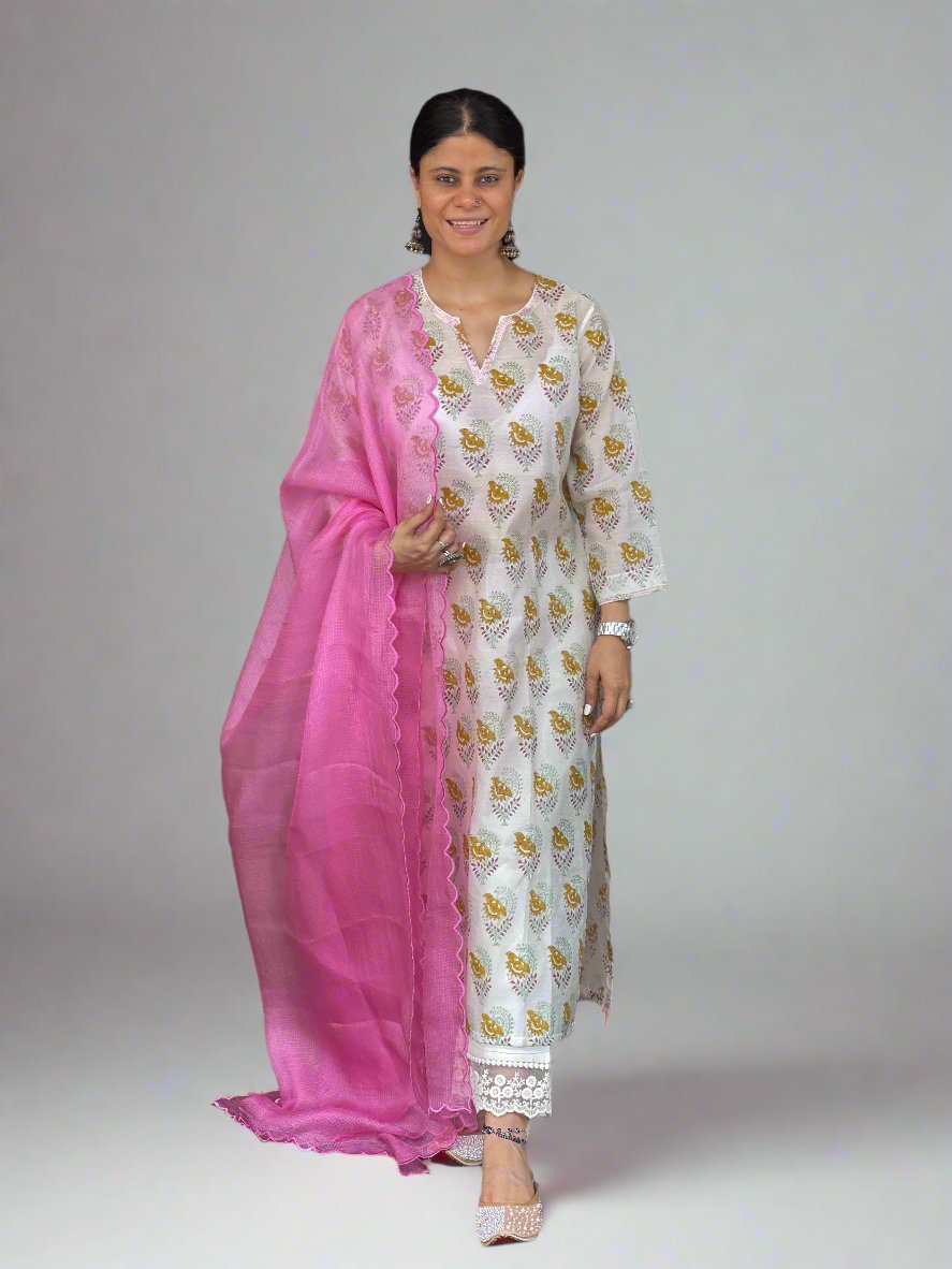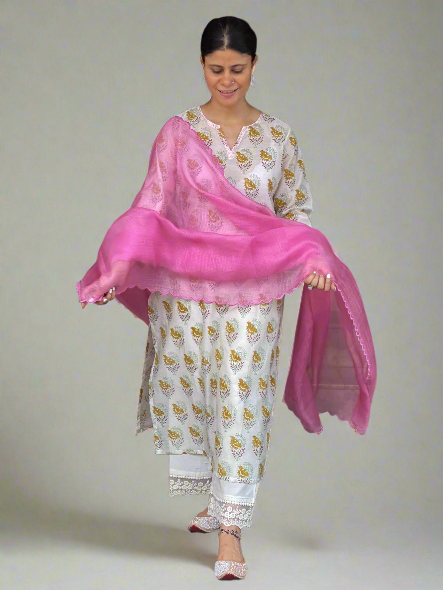 Handloom & handblock printed chanderi silk cotton kurta with kota silk dupatta. Dupatta has scallop embroidery.