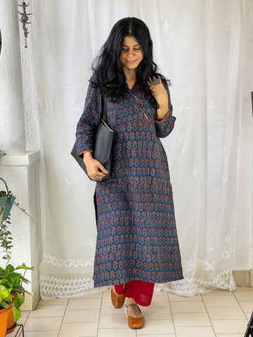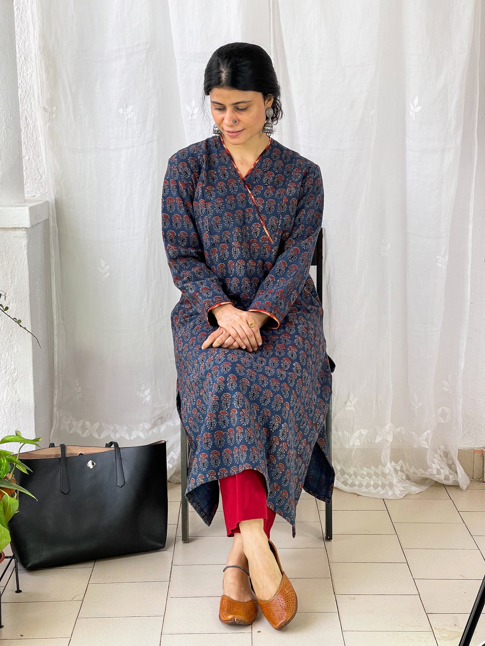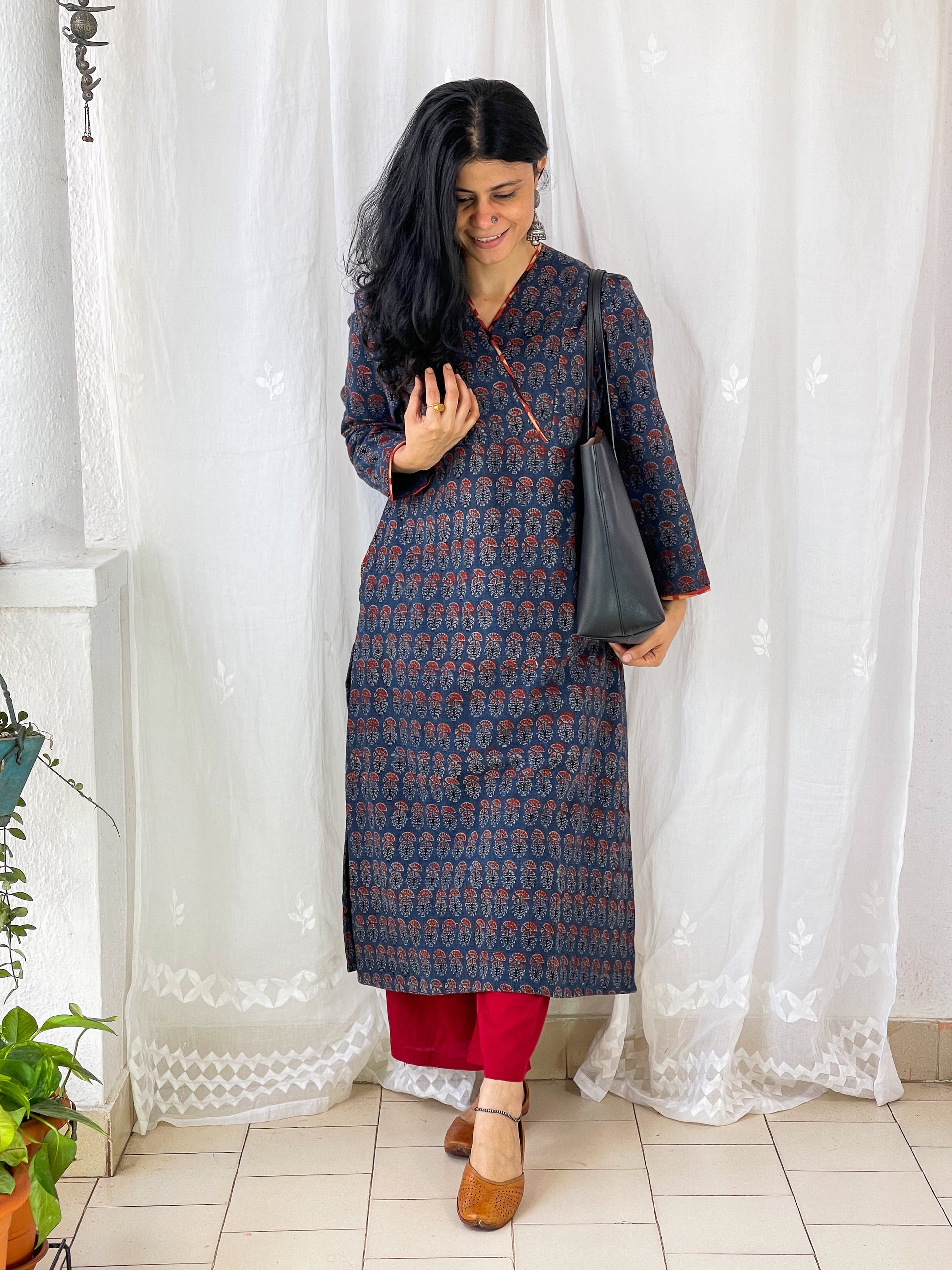 About the Kurta- Handwoven & Handspun Cotton Handblock Printed Ajrakh Kurta With Pockets and pipping border.
