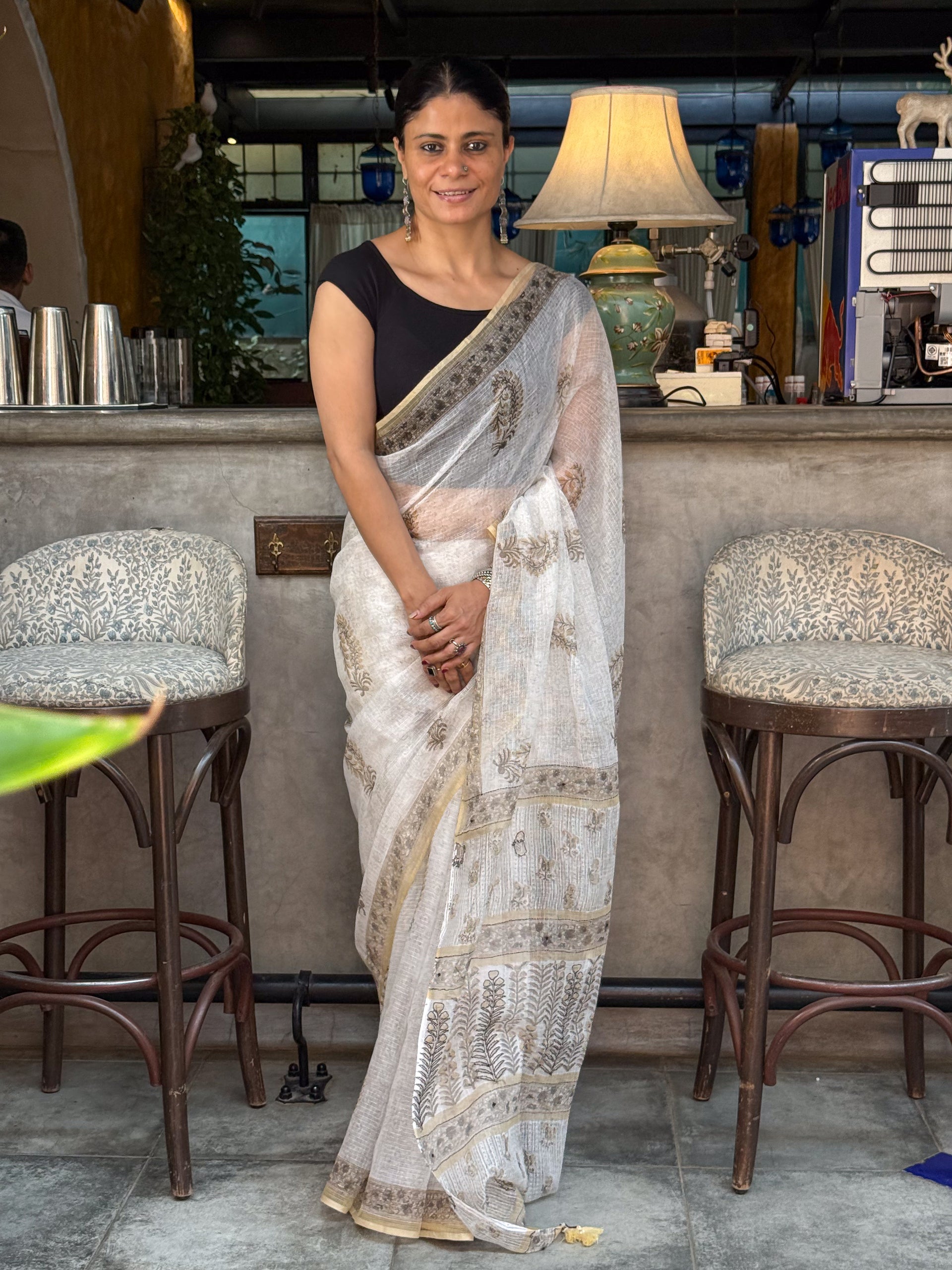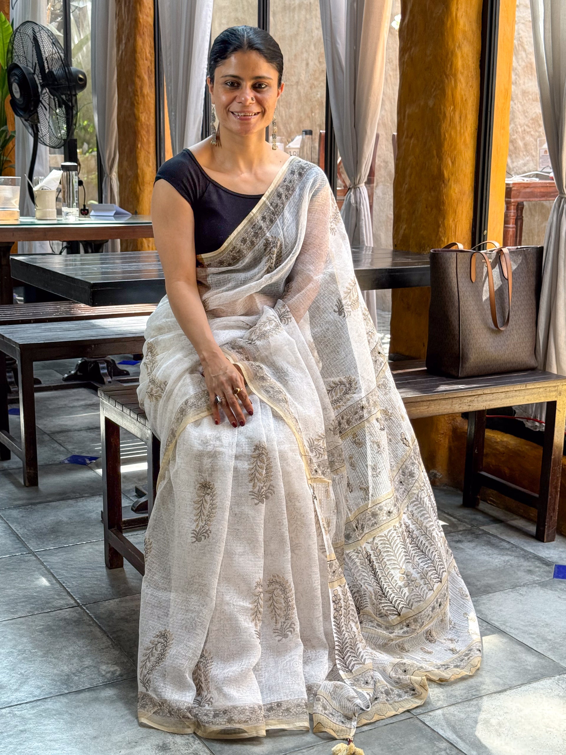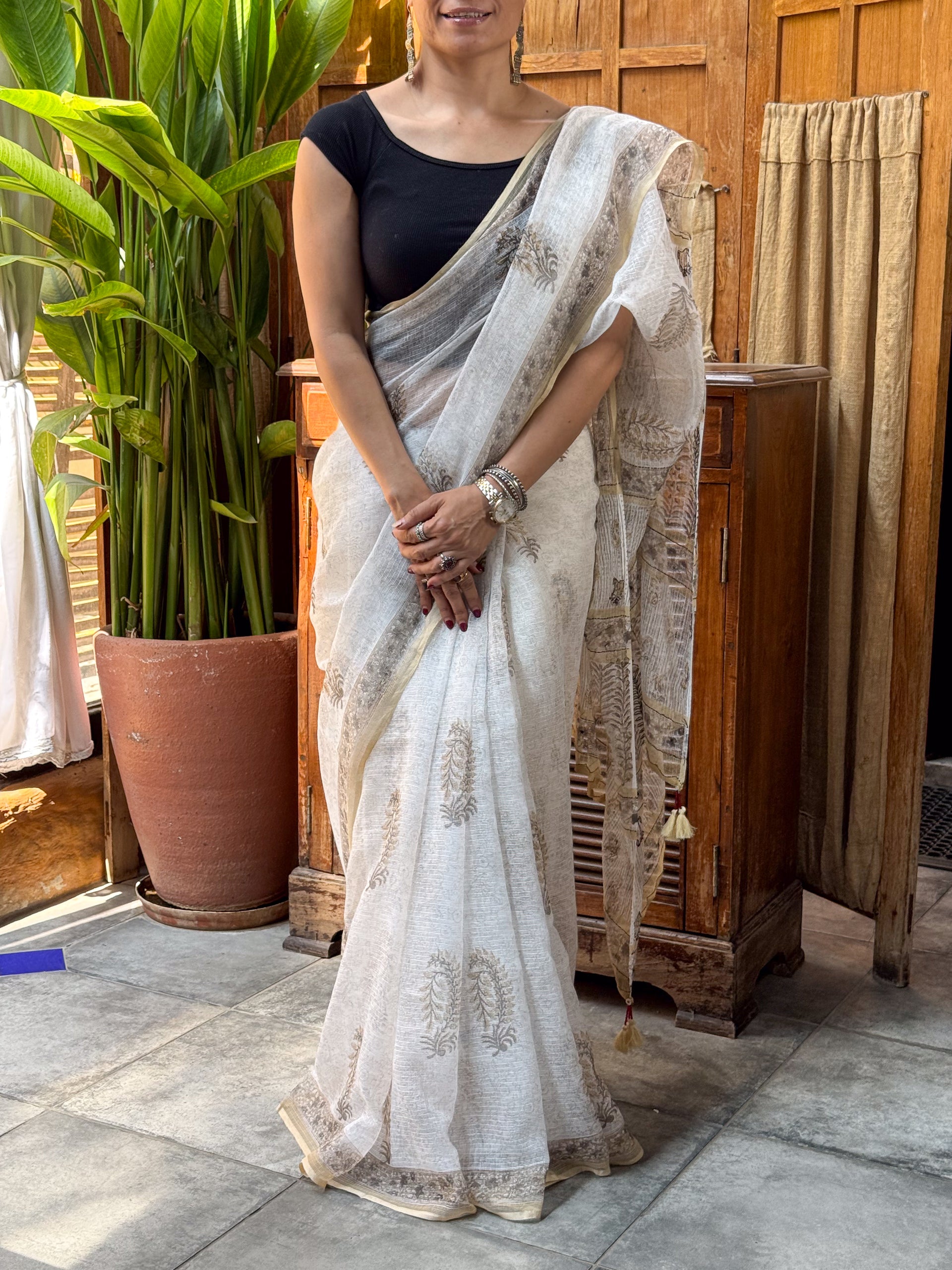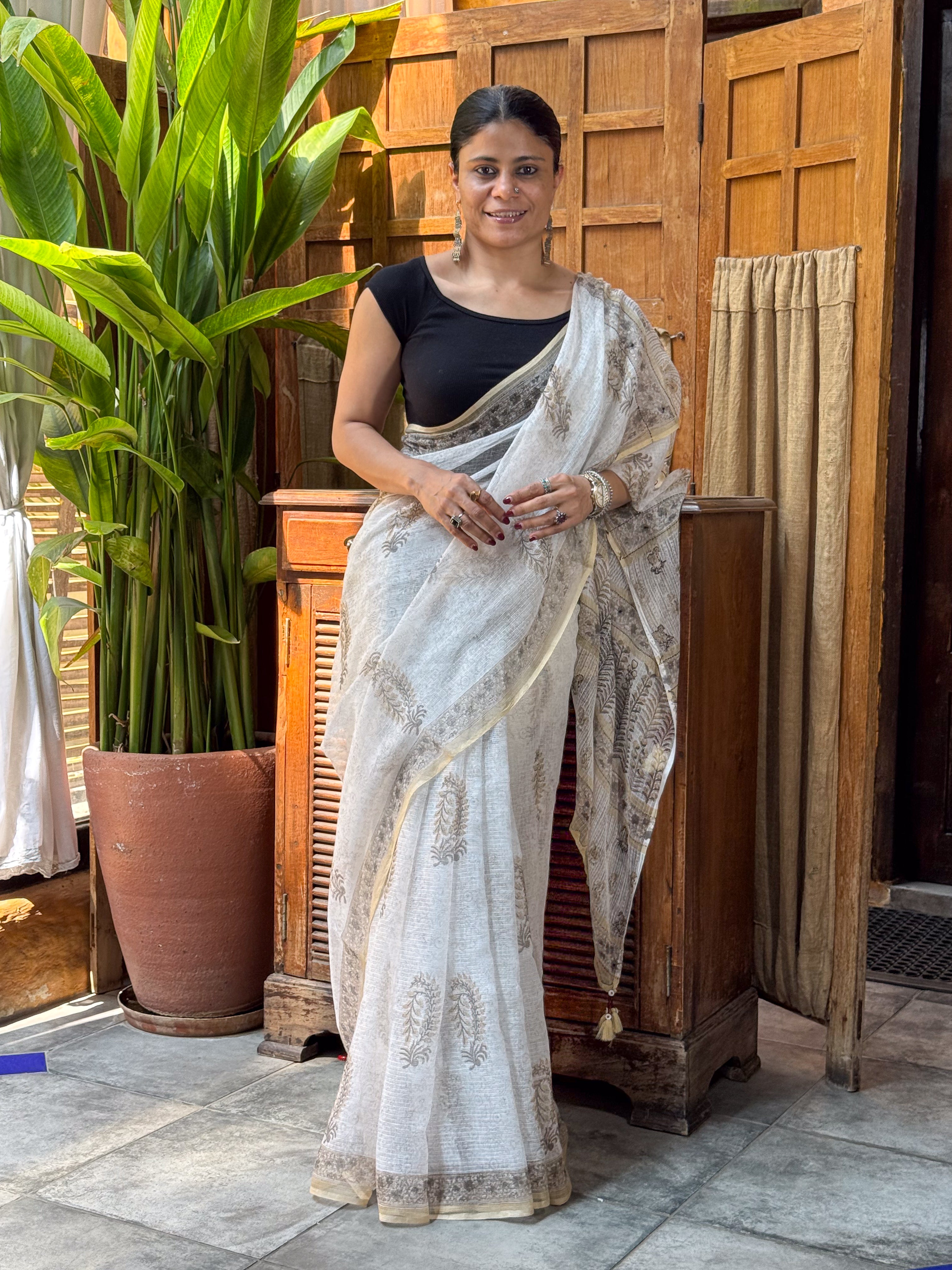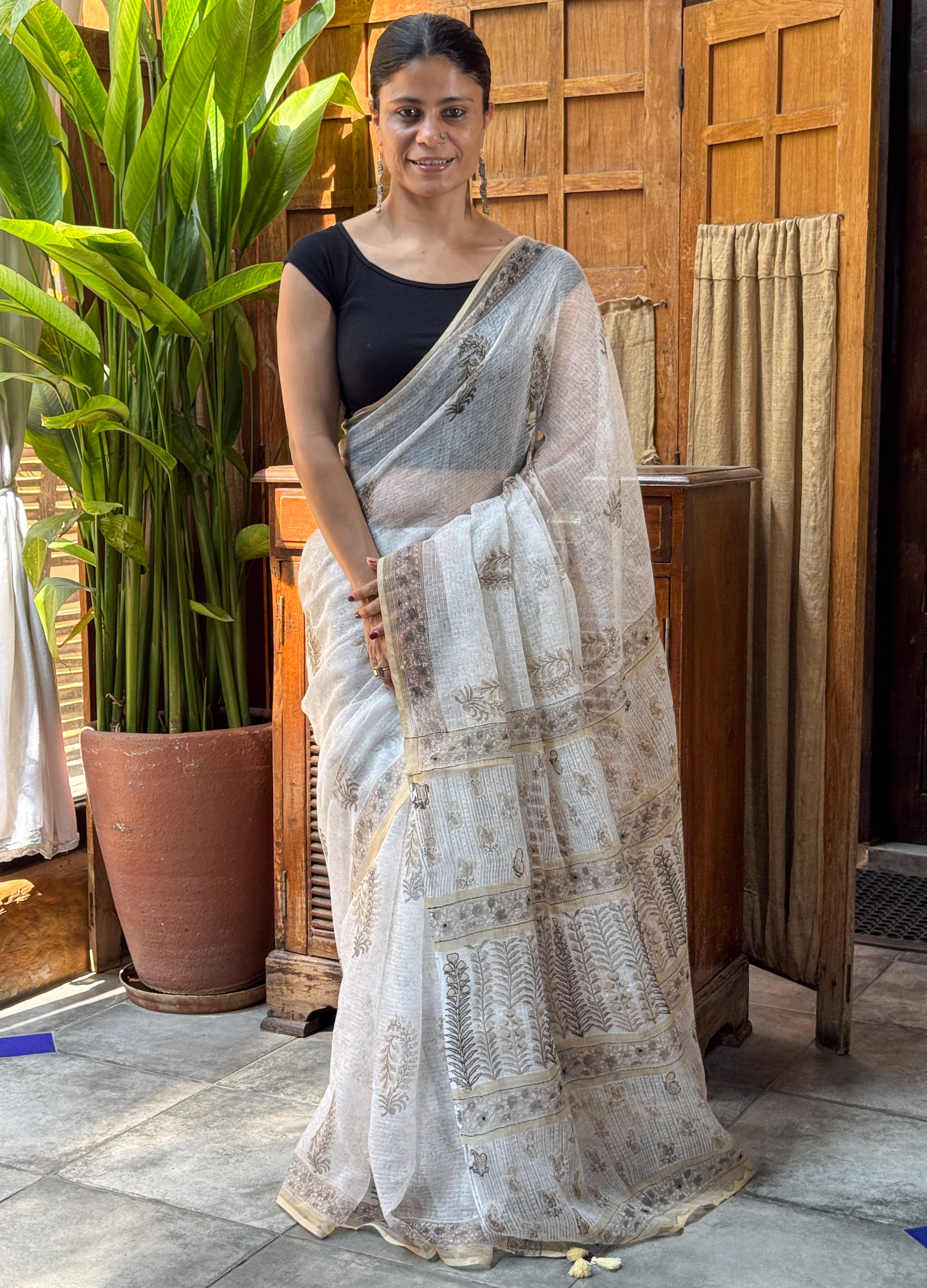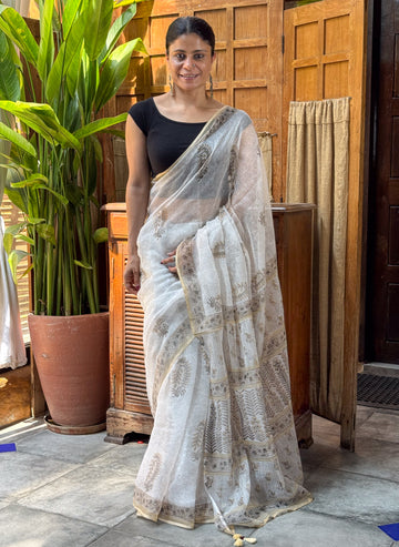 : Pure Kota Doria cottonThis handmade Kota Doria saree features delicate pigment or gadh handblock prints that highlight its light, airy texture. The pallu is enhanced with hand-done running stitch embroidery over the block prints, along with running stitch detailing on the pallu-side border. Finished with hand-embroidered tassels at the pallu edges, the saree reflects understated elegance and fine craftsmanship.