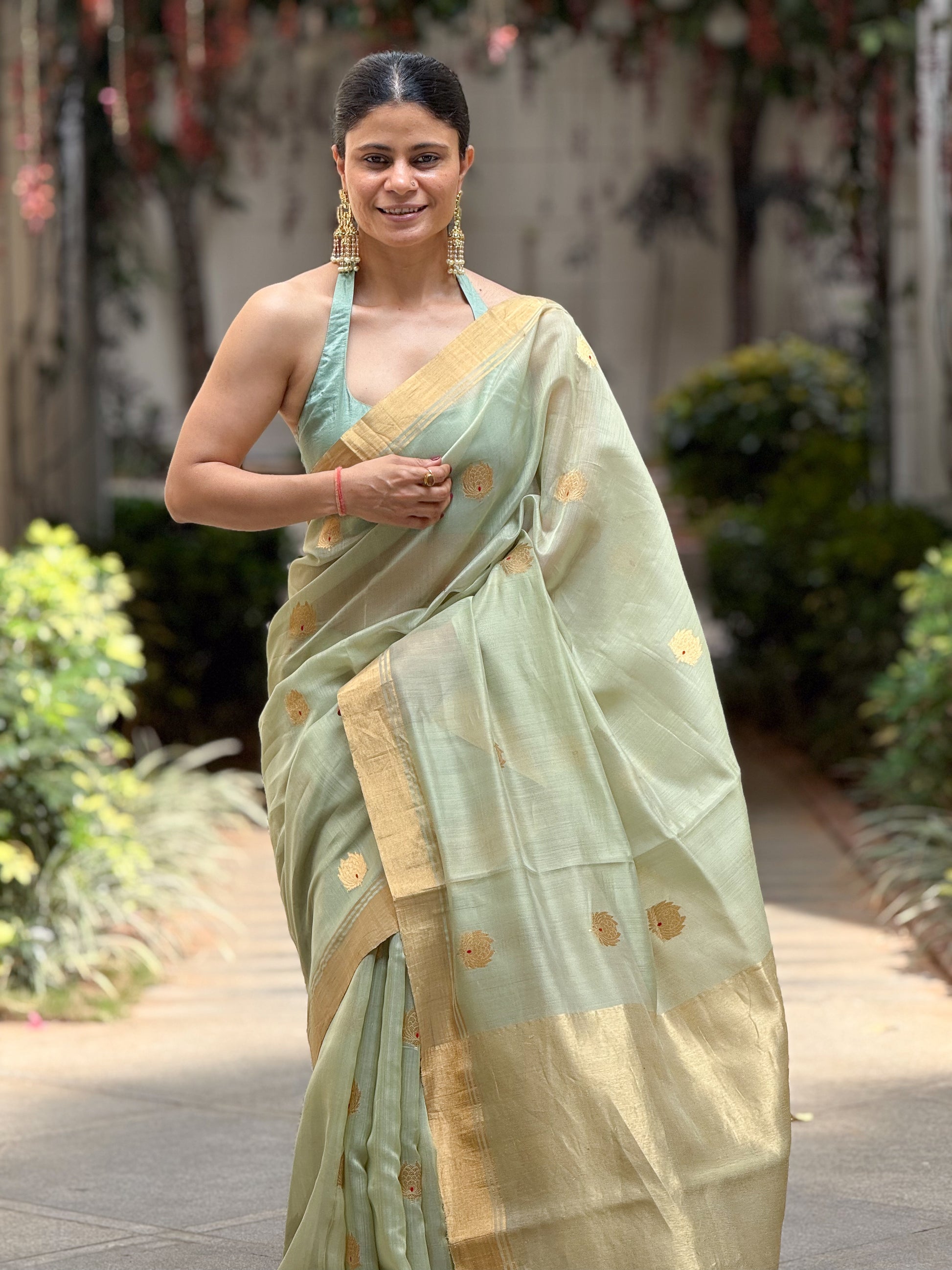 About the Saree - This exquisite Handloom Chanderi Silk saree features a surface-designed body adorned with silk and zari motifs all over, complemented by a zari pallu and zari border. Lightweight with a soft sheen, the saree blends traditional elegance with effortless day-to-evening versatility.