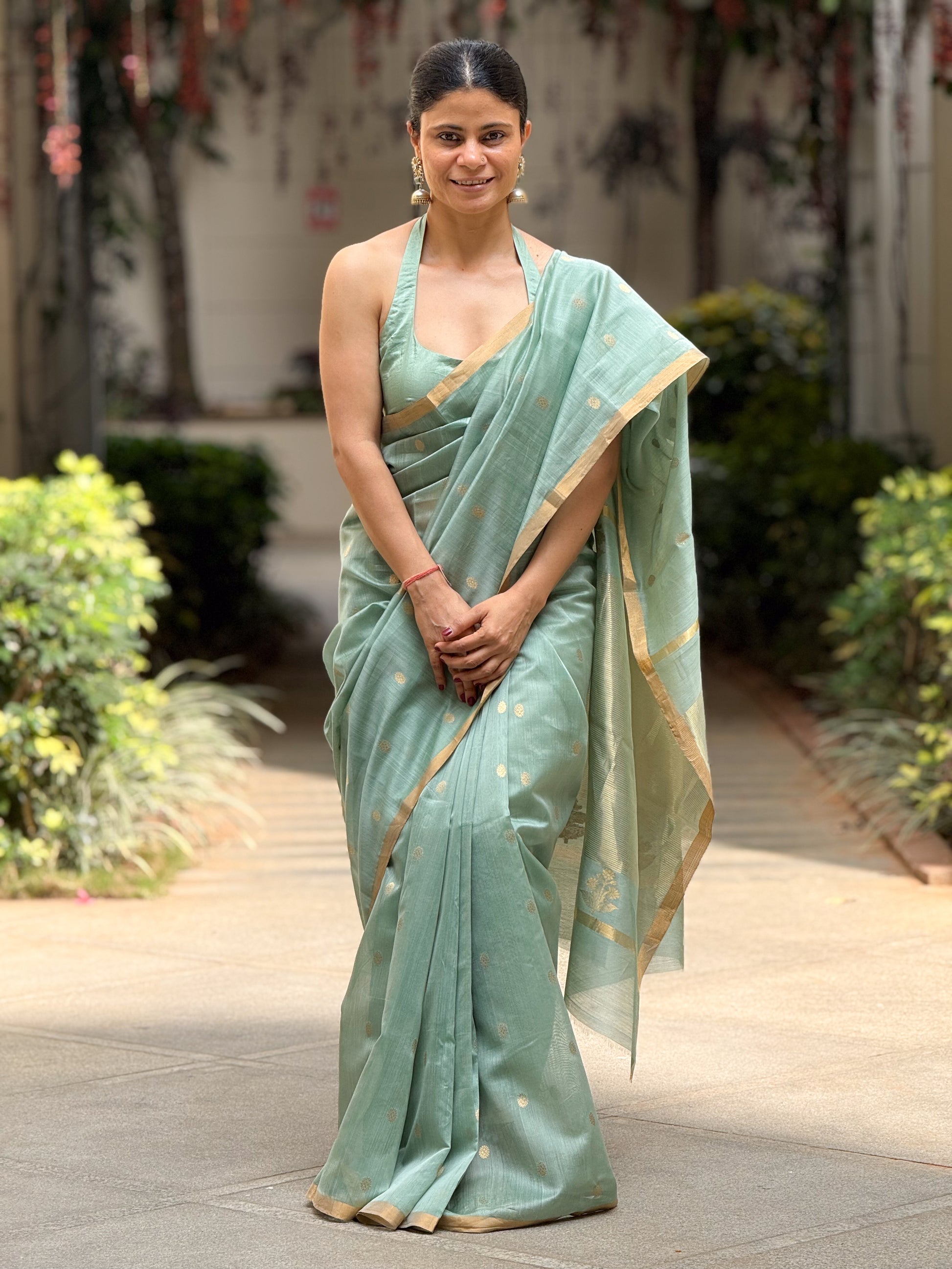 About the Saree - This elegant Handloom Chanderi Cotton Silk saree features a surface-designed body with zari bootis, complemented by a floral motif pallu, zari pallu, and zari border. Lightweight and breathable with a subtle sheen, the saree combines traditional charm with effortless day-to-evening elegance.