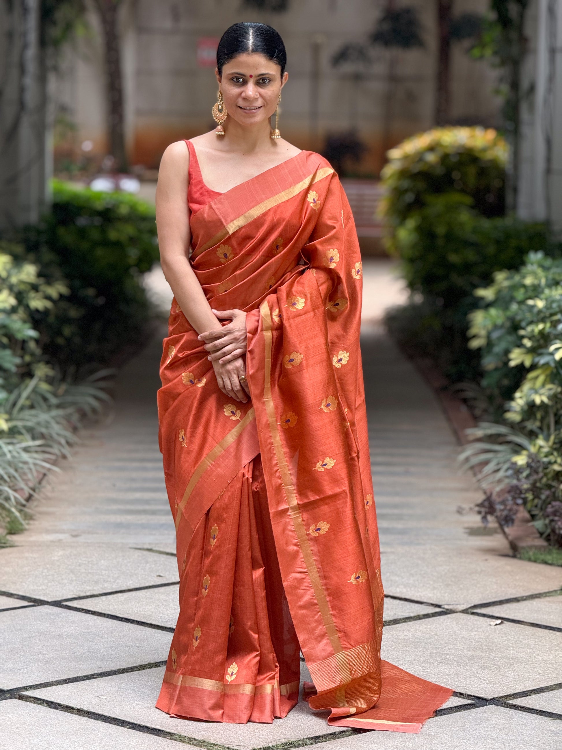 About the Saree -Handloom Chanderi Pattu silk saree, adorned with delicate handmade gold motifs spread all over, finished with a classic mashru border. It carries a subtle sheen, is soft to touch, and lightweight-perfect for day-to-night versatility