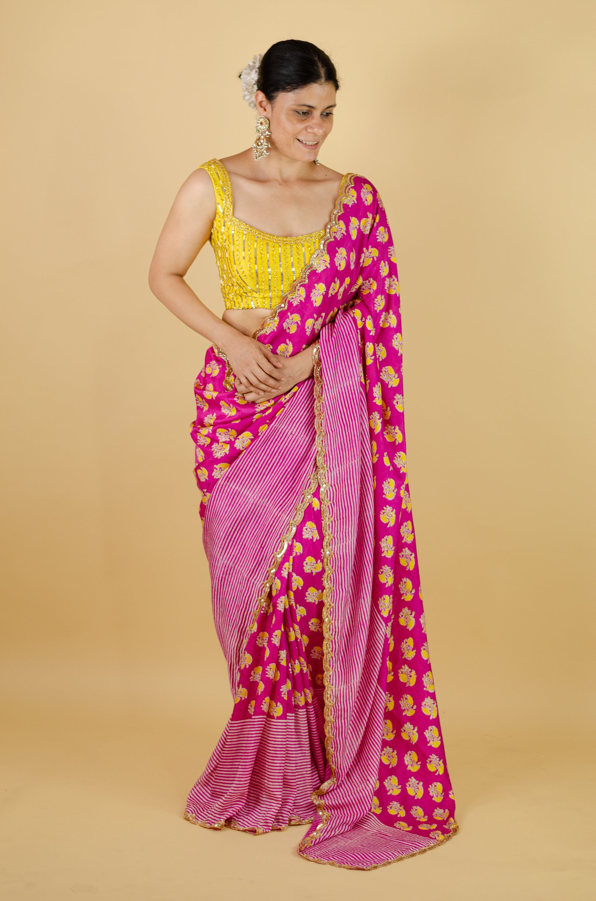 About the Saree - Discharge handblock printed in natural resistance organic certified sequence and zardosi hand embroidered handloom mulberry silk saree