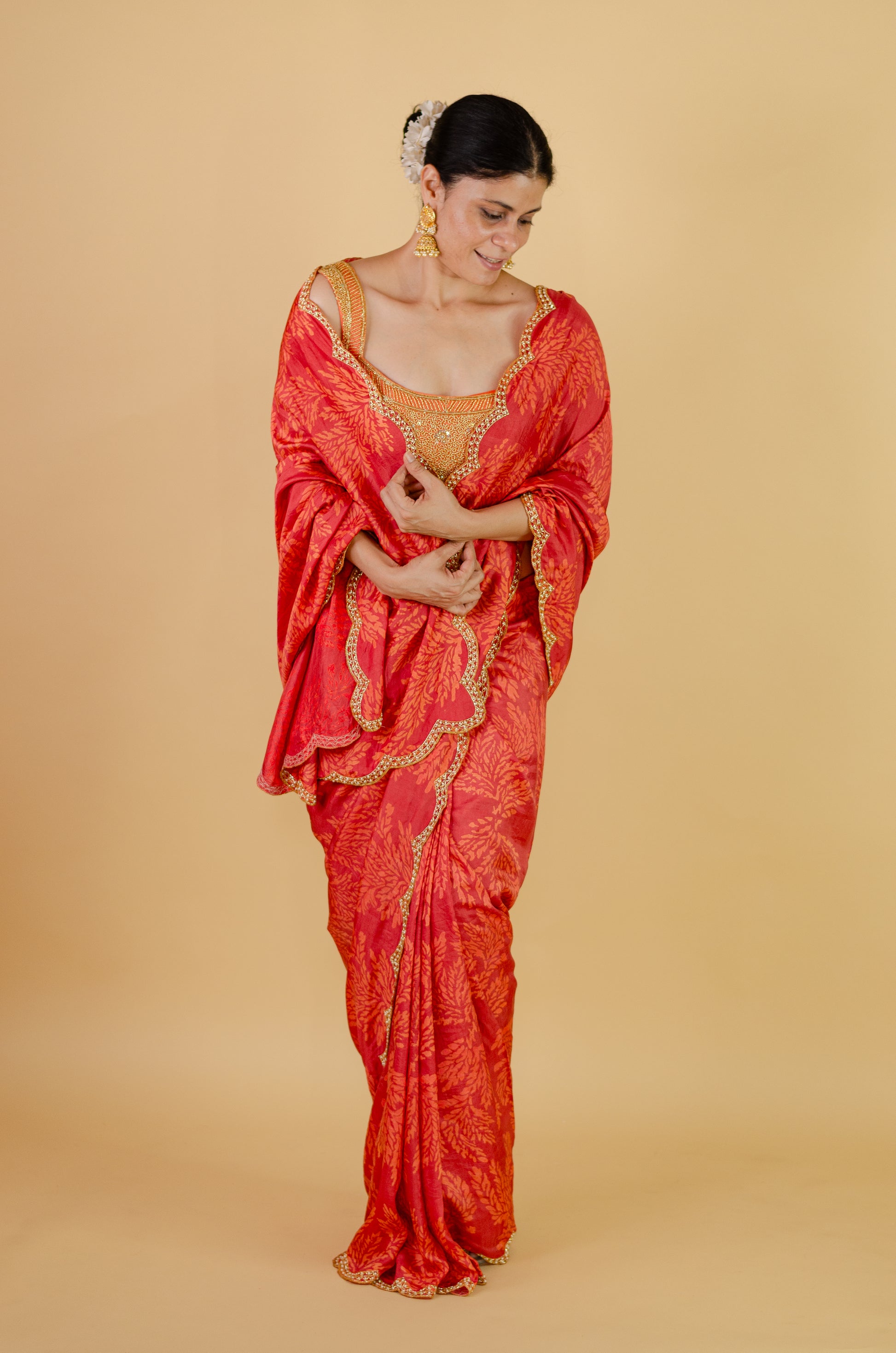 About the Saree - Discharge handblock printed in natural resistance organic certified sequence and zardosi hand embroidered handloom mulberry silk saree