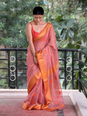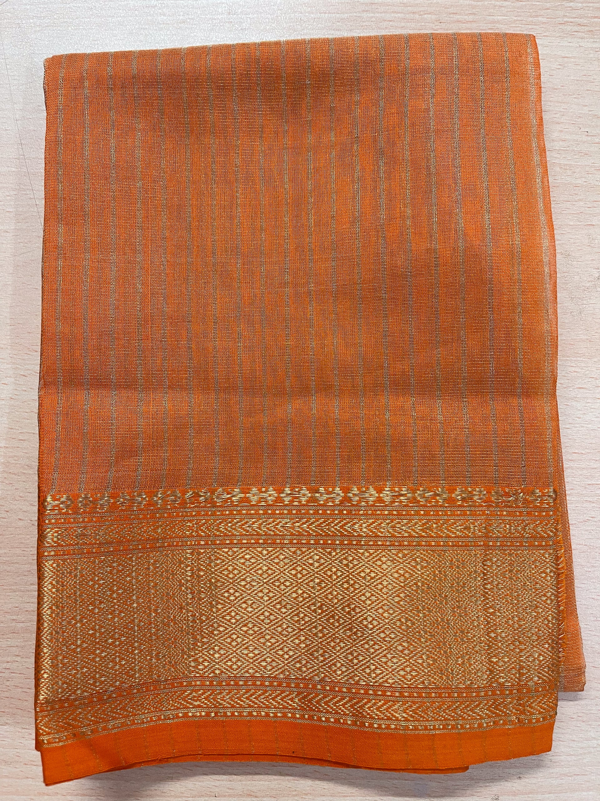 : Handloom Maheswari SilkThis saree is a handloom-woven Maheshwari Tissue Silk, crafted by skilled artisans. Woven with fine silk yarns, the fabric has a natural golden sheen that catches light beautifully, giving the saree a regal and festive appeal. Despite its opulent look, Tissue Silk is surprisingly lightweight, offering a crisp yet graceful drape.