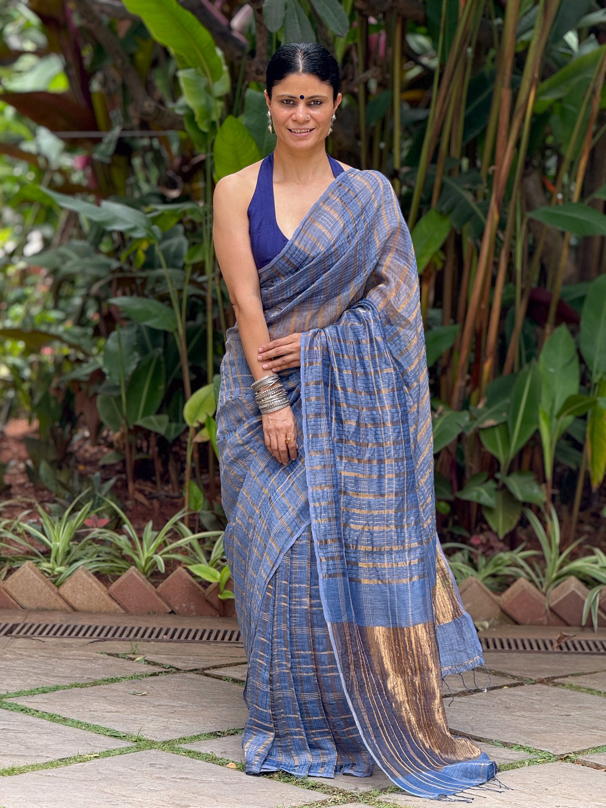 About the Saree - Handloom Linen Zari Silk Saree. Woven on traditional handlooms, this saree brings together the breezy comfort of linen, the gentle luster of silk, and the festive brilliance of zari detailing, while the zari-woven border and pallu add just the right amount of elegance and richness.