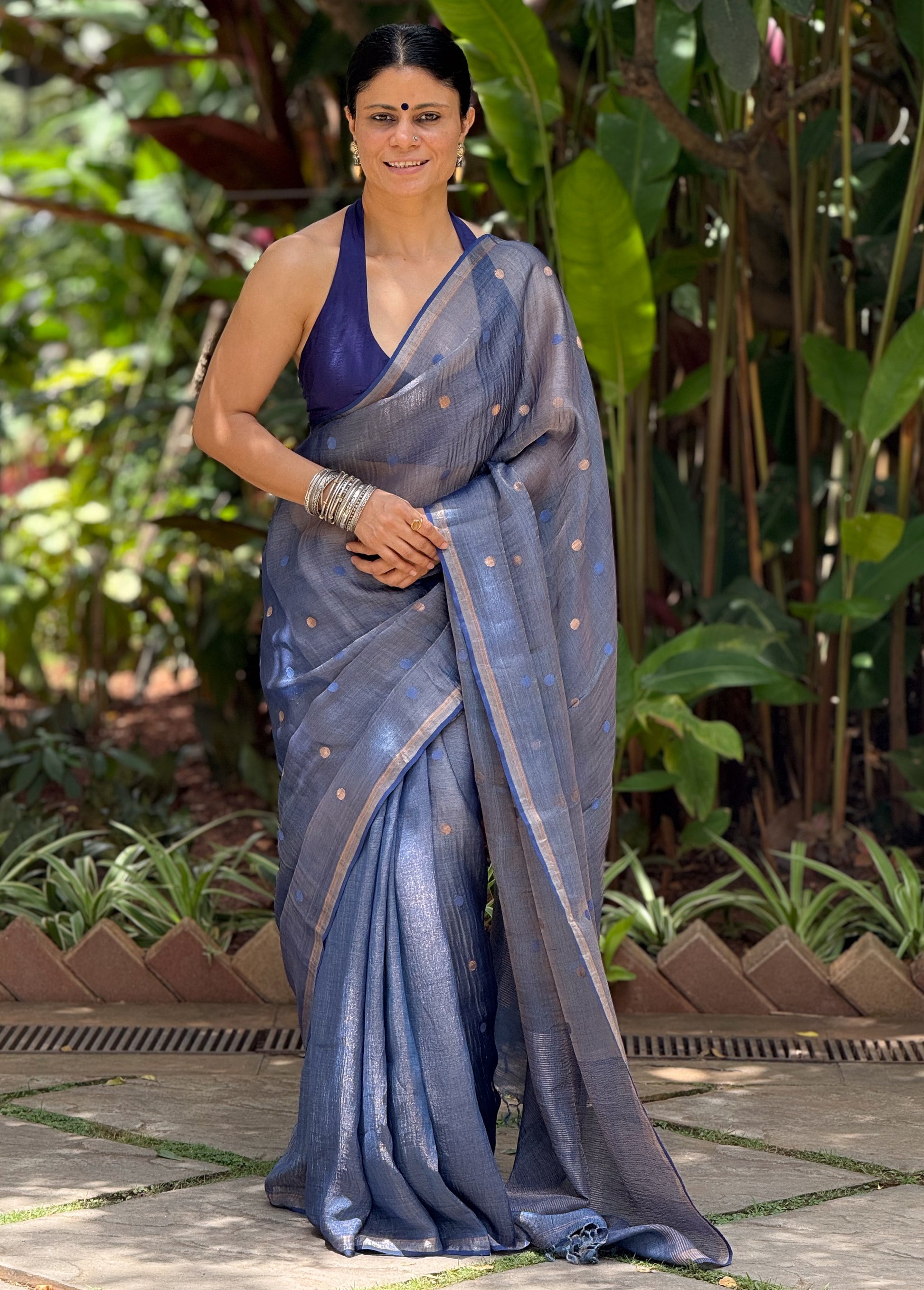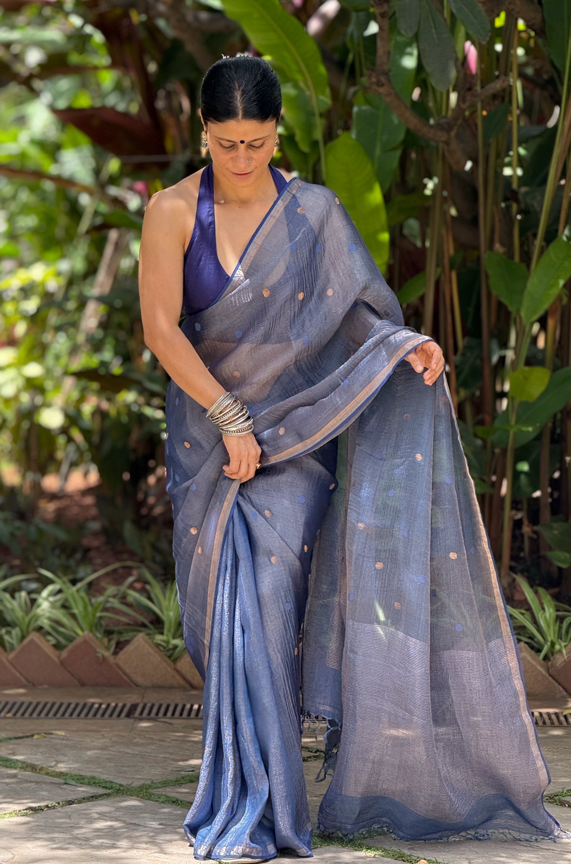 About the Saree - Handloom Linen Silk Tissue Jamdani Saree. Woven by skilled artisans on traditional handlooms, this saree combines the crisp texture of linen, the luxe sheen of silk, and the light, airy finish of tissue weaving. Adorned with intricate Jamdani motifs, each saree tells a story — woven, not embroidered — in the age-old tradition of Bengal's finest textile heritage.