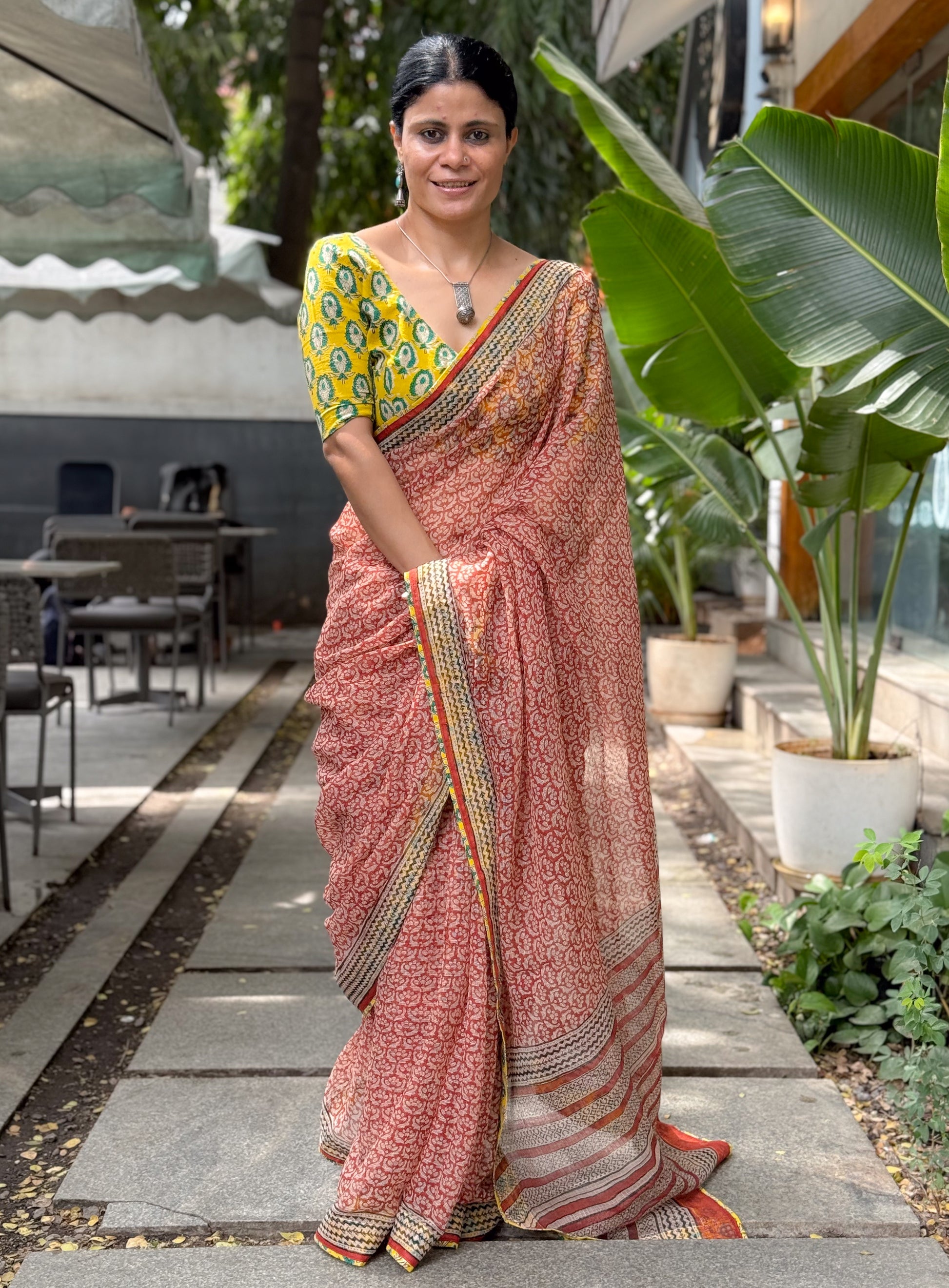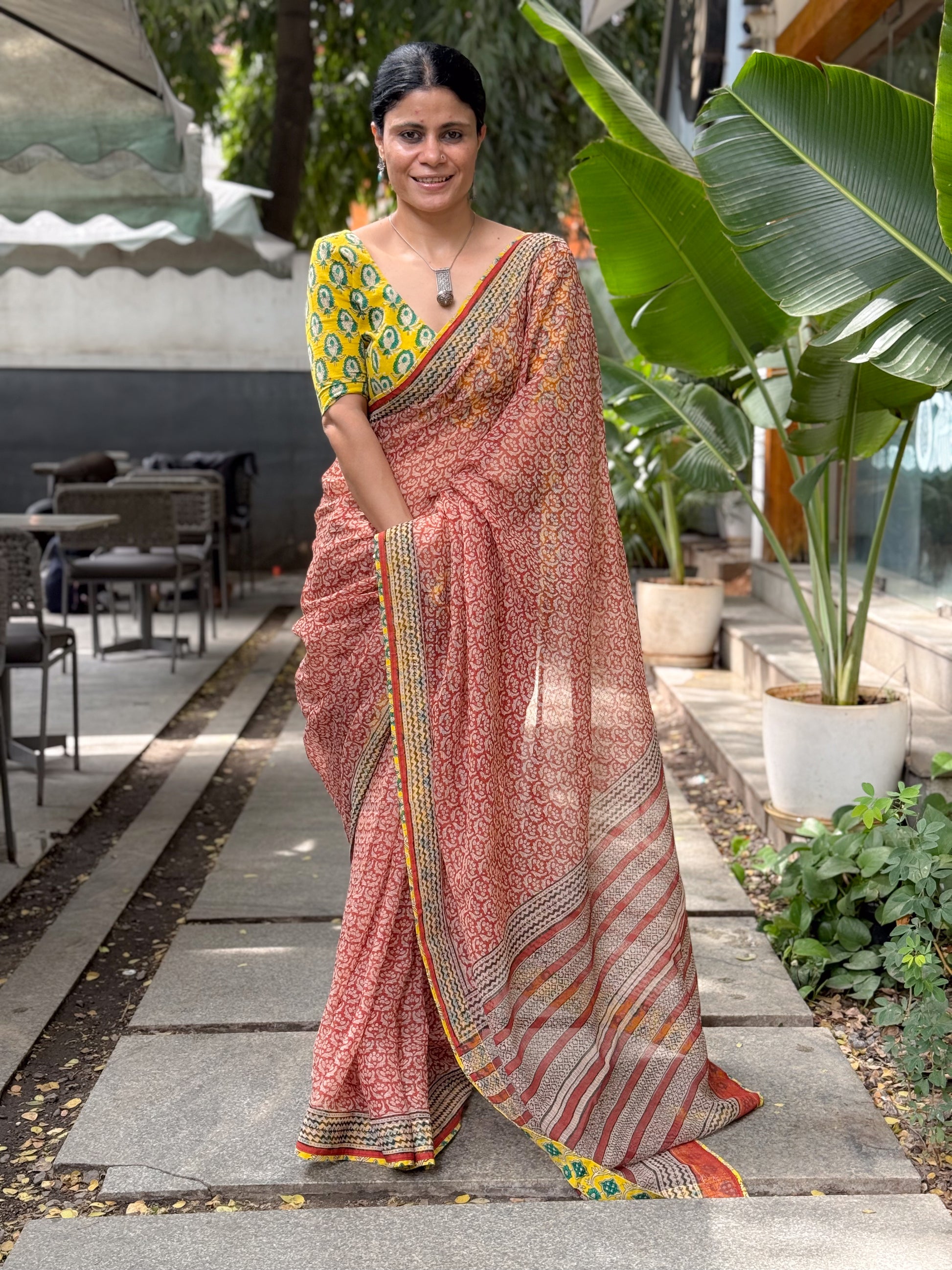Disclaimer - As this saree is handmade, handblock printed, and naturally dyed, slight irregularities in weave, print, or color are natural and celebrated as a mark of true craftsmanship. Colors may vary slightly due to photography or individual screen settings.