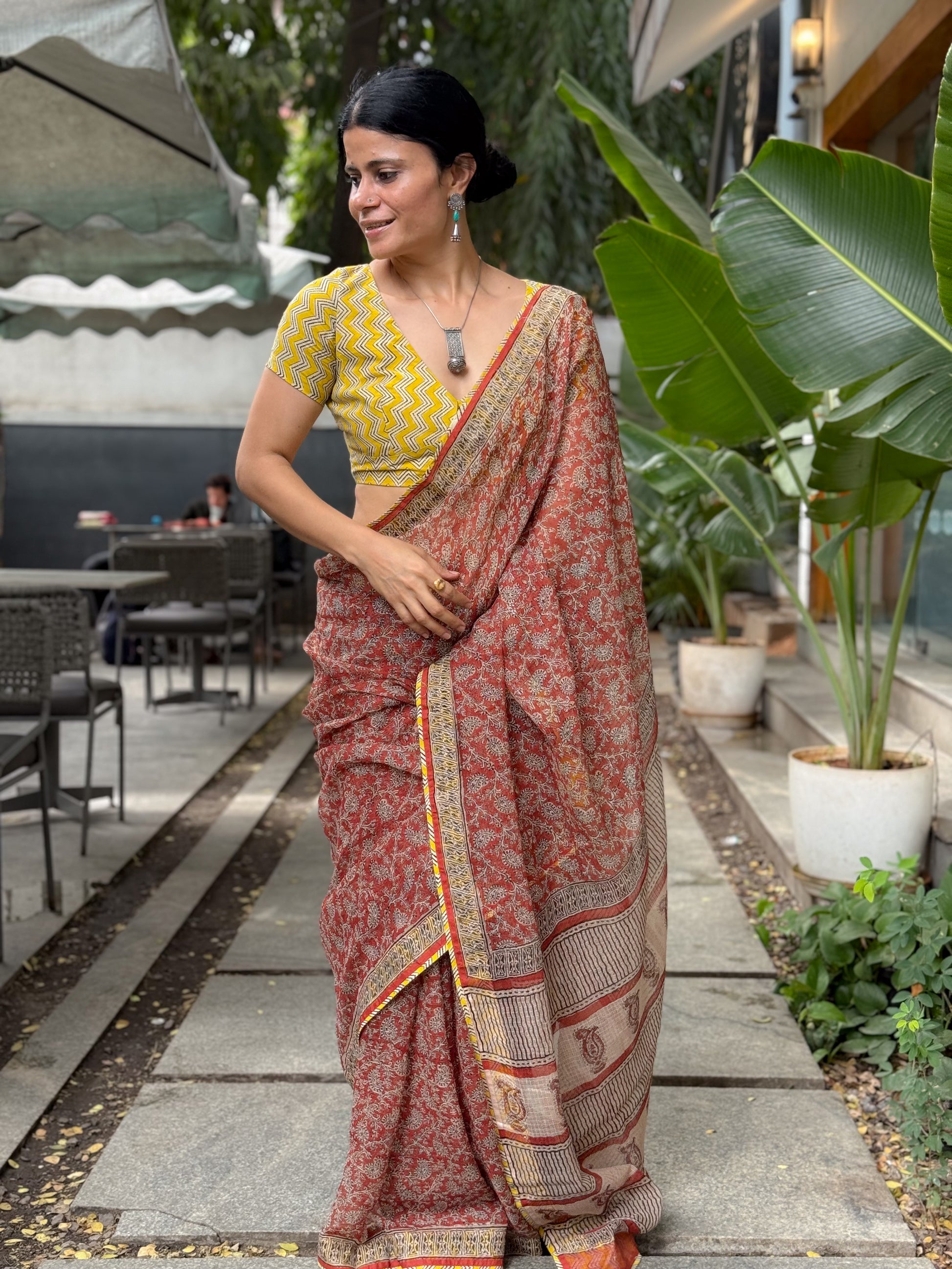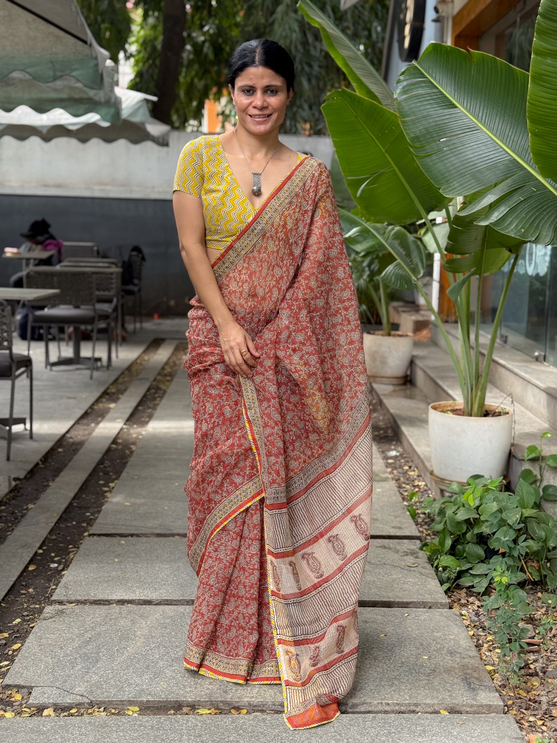 Disclaimer - As this saree is handmade, handblock printed, and naturally dyed, slight irregularities in weave, print, or color are natural and celebrated as a mark of true craftsmanship. Colors may vary slightly due to photography or individual screen settings.
