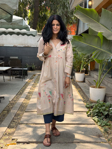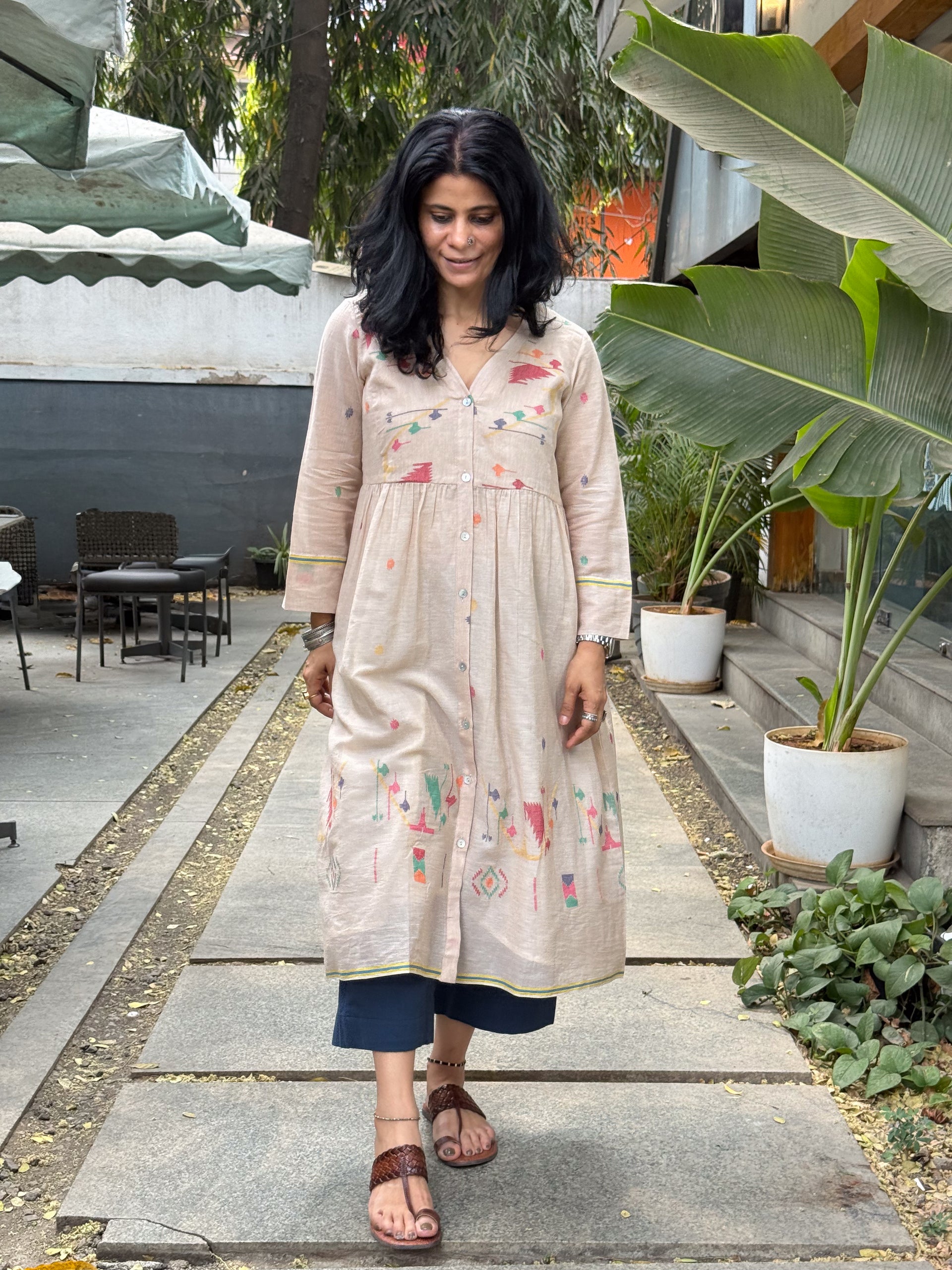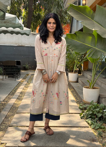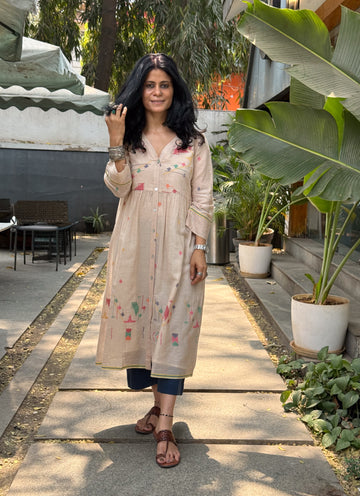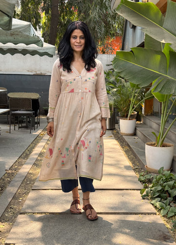 : Handwoven JamdaniThis Jamdani kurta is woven on traditional handlooms by skilled artisans, featuring delicate Jamdani motifs that highlight the charm of handcrafted textiles. The classic Jamdani aesthetic, making it perfect for intimate gatherings, or everyday elegance.