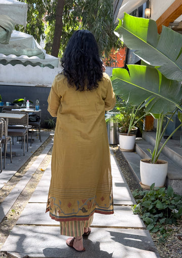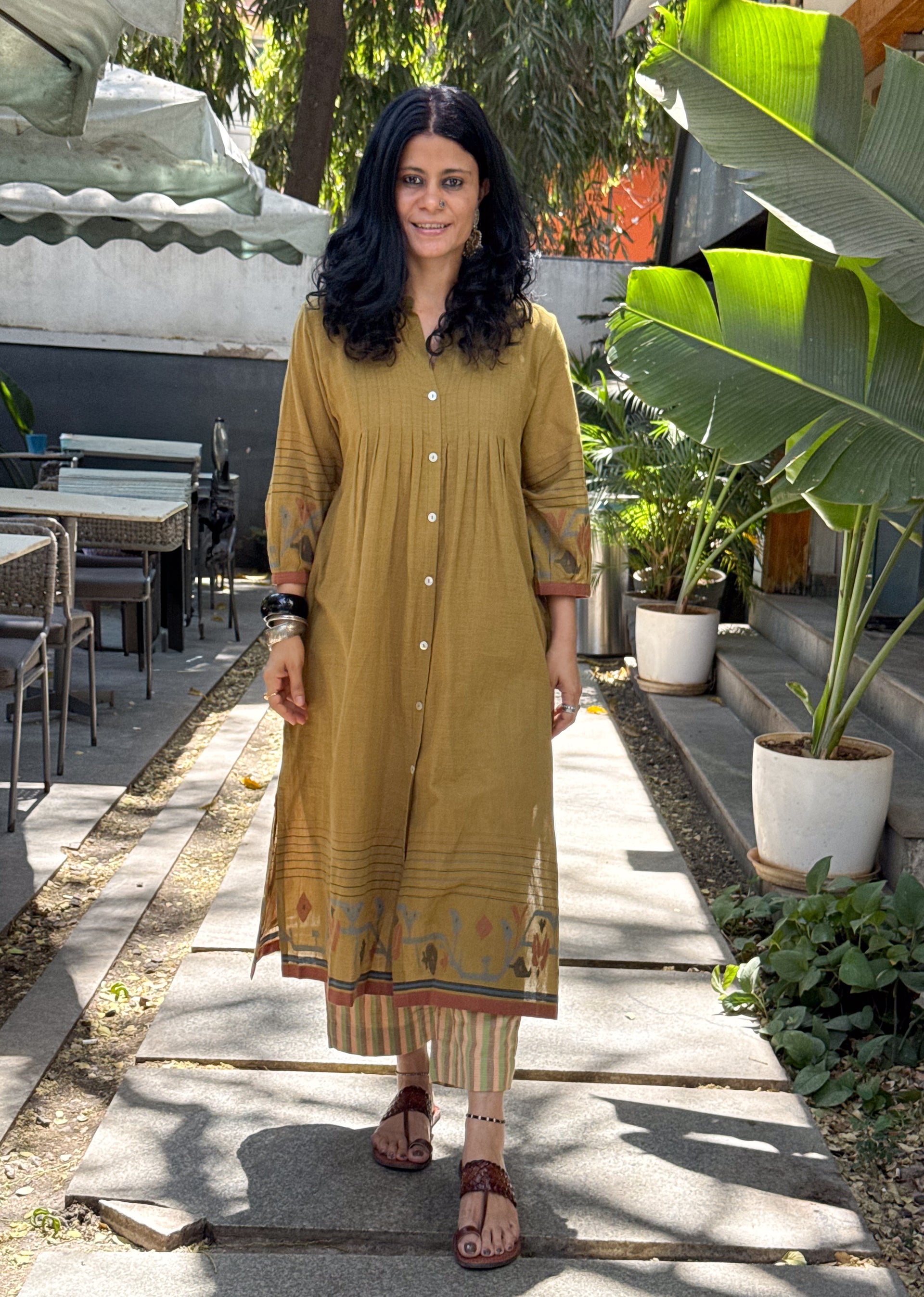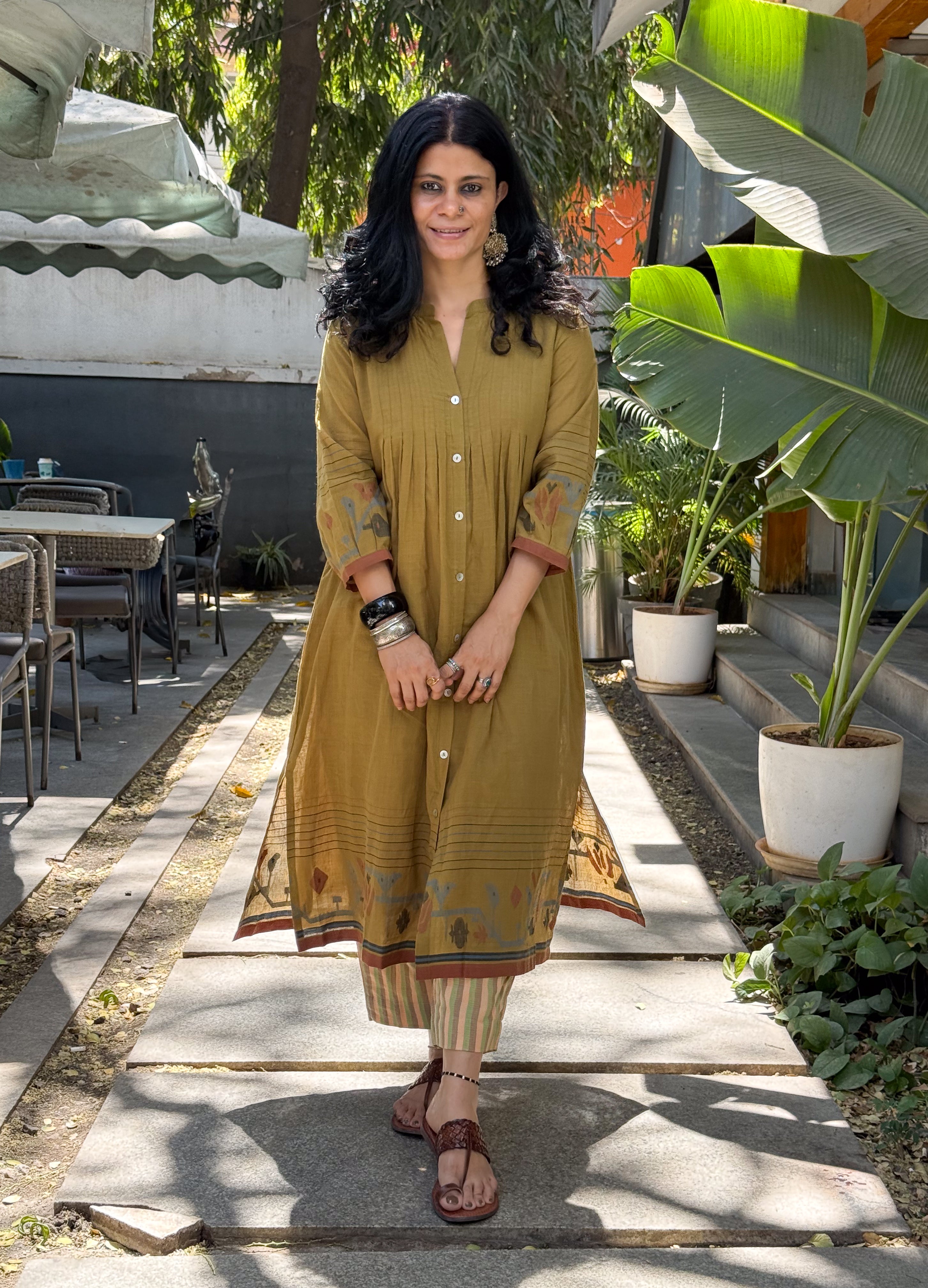: Handwoven JamdaniThis Jamdani kurta is woven on traditional handlooms by skilled artisans, featuring delicate Jamdani motifs that highlight the charm of handcrafted textiles. The classic Jamdani aesthetic, making it perfect for intimate gatherings, or everyday elegance.
