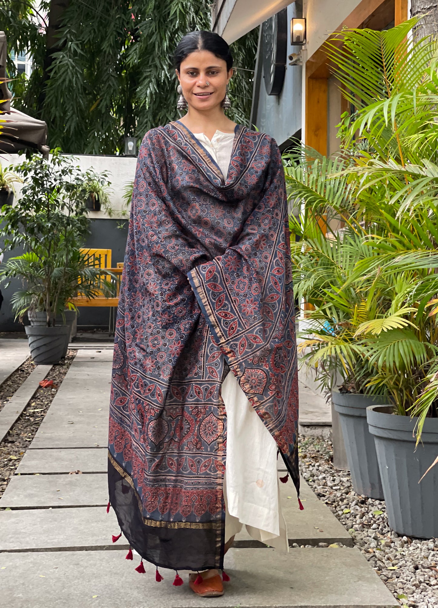 Details - Natural Dyed Handblock Printed Ajrakh chanderi Silk Dupatta