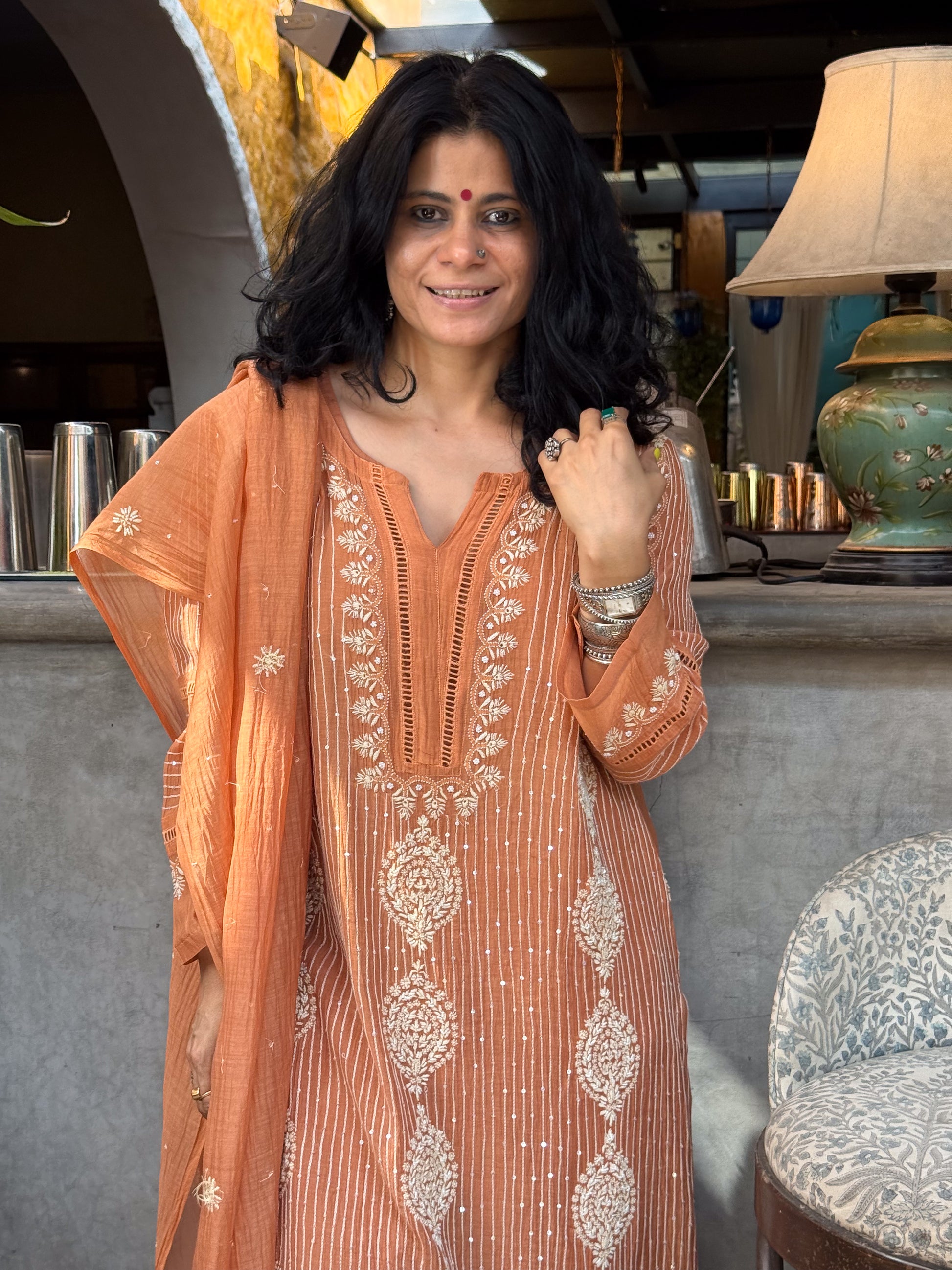 About the Kurta- Handembroidered Chikankari chanderi muslin kurta and dupatta