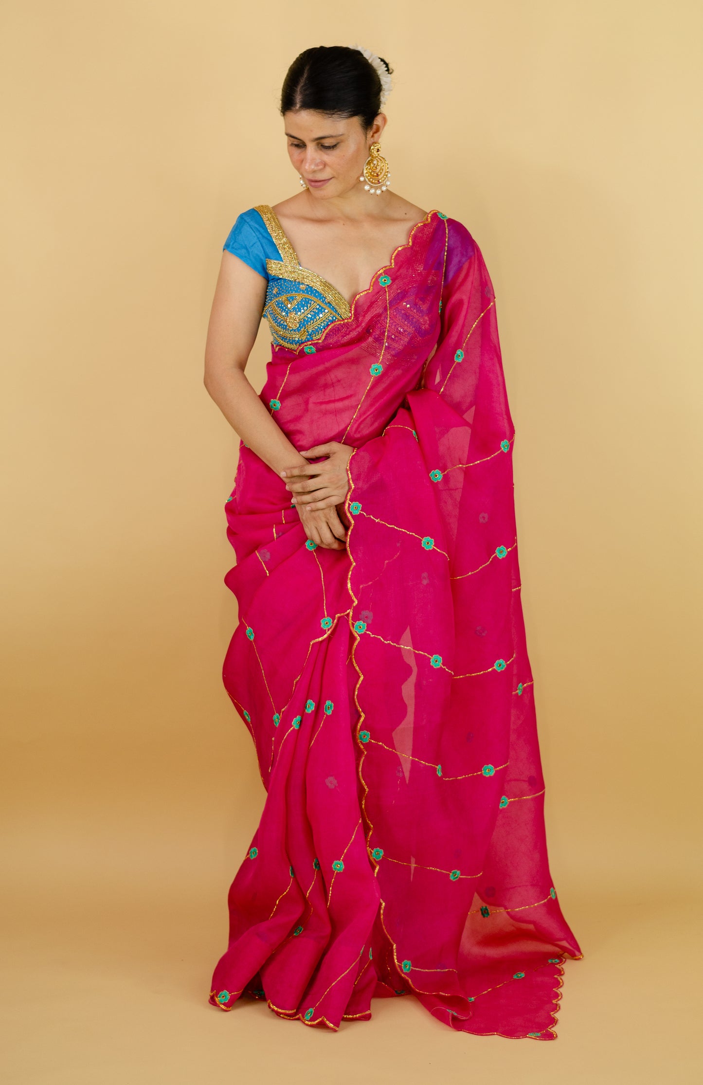 Sequence & Resham thread Hand Embroidered Handloom Organza Silk Saree.